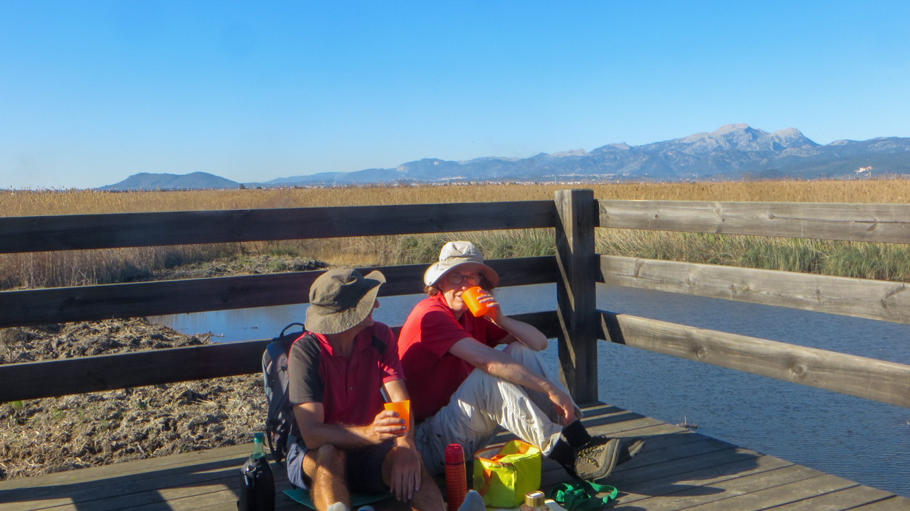 Vid lunchdags tornar ett fågeltorn upp sig. Vi hoppas på en bänk, men nöjer oss med trägolvet. Våra sittunderlag är med. Där sitter vi med blickarna mot en damm och kaviarsmörgås och hårdkokt ägg i handen. En gråhäger landar och hittar snabbt ett perfekt observationsställe snett emot oss. Rätt som det är – nu är ägget uppätet – viftar hägern med sina stiliga vingar och flyger i väg. Vår blick följer efter och möter en rovfågel – av storleken, vingarnas färg och flygsätt att döma antagligen en dvärgörn.
