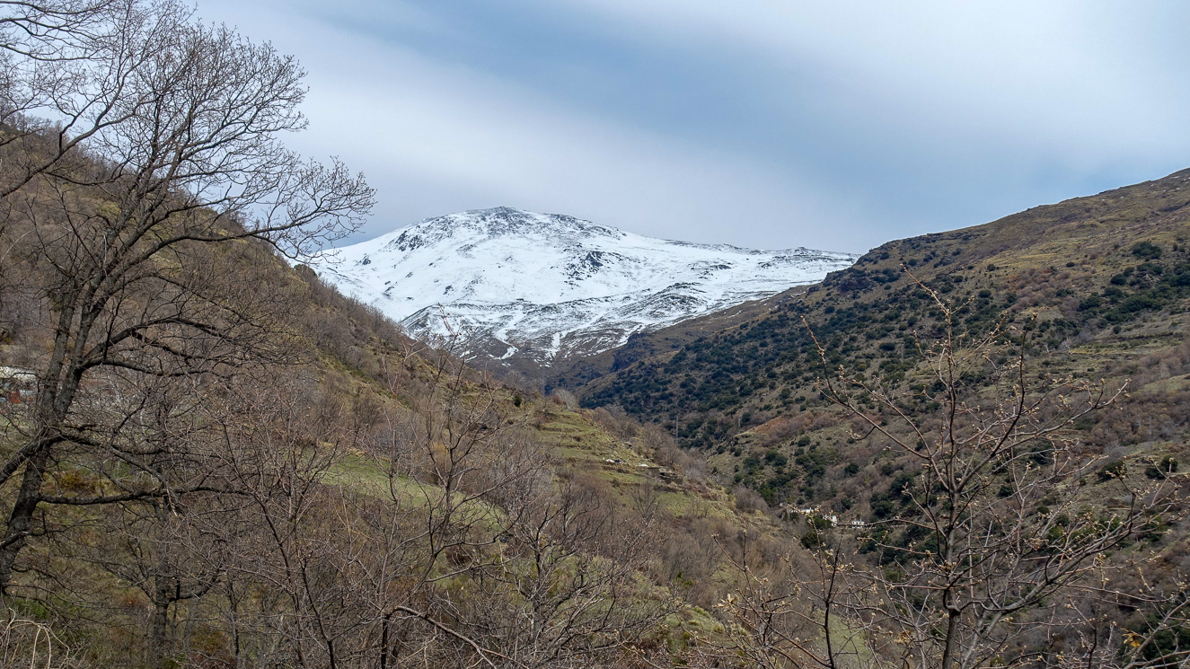 I kanten på byn passerar vi rio Poqueira och vänder tillbaka i riktning mot Capileira, men nu på andra sidan floden. I detta magnifika, bergiga och därför svårodlade landskap har några gett sig i kast med mindre jordbruk. En nyfiken tamget tittar efter oss och en häst gnäggar till hälsning. Även issmältningen ger sig till känna så här tidig vår med, klart passerbara, vattendrag på stigen.