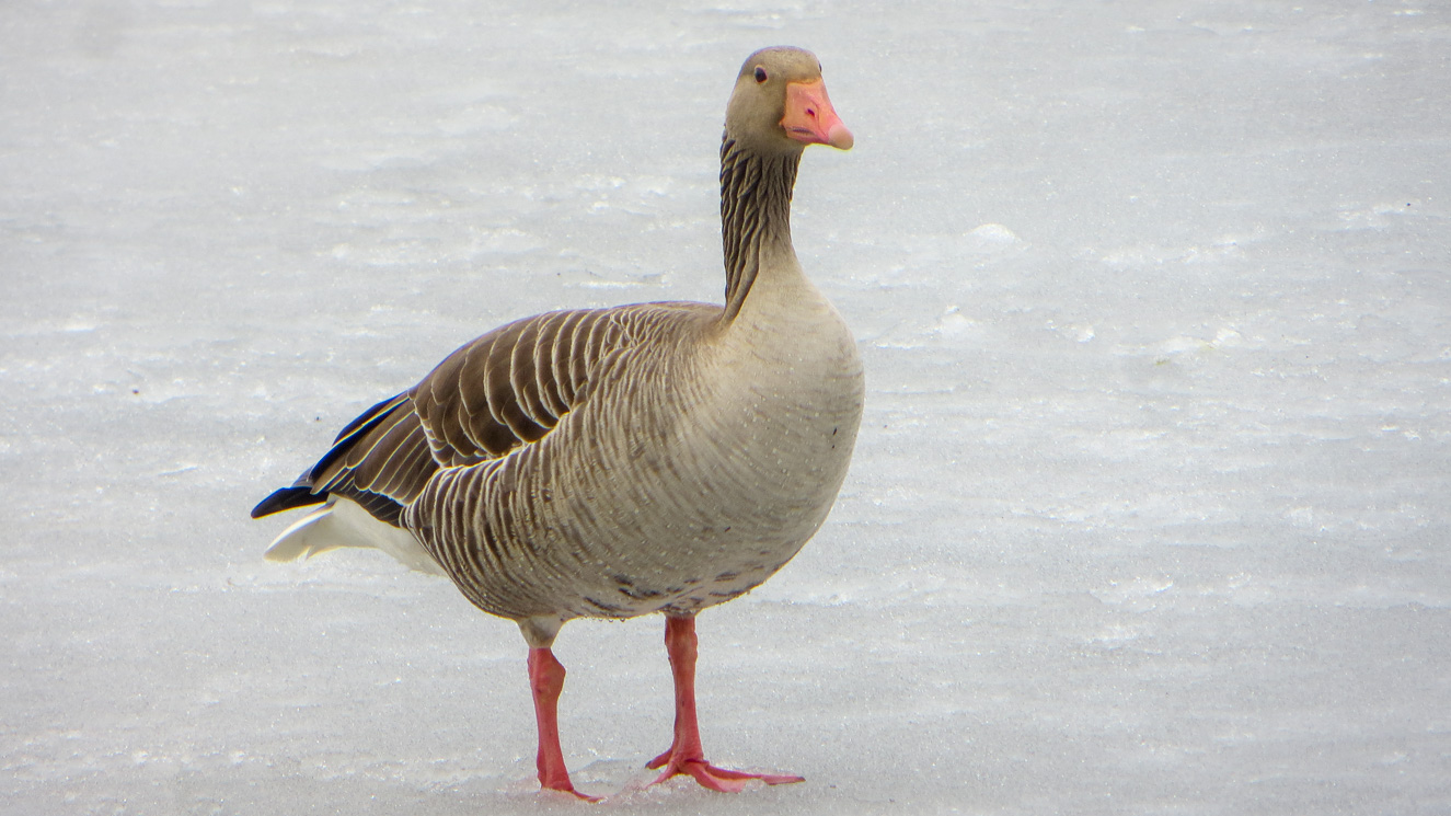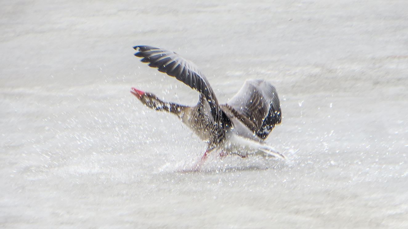 En knölsvan hittar något ätbart vid iskanten. Mumms! En sädgås går in för landning. Det går så våldsamt till att vattnet på isen skvätter. Splashhh!