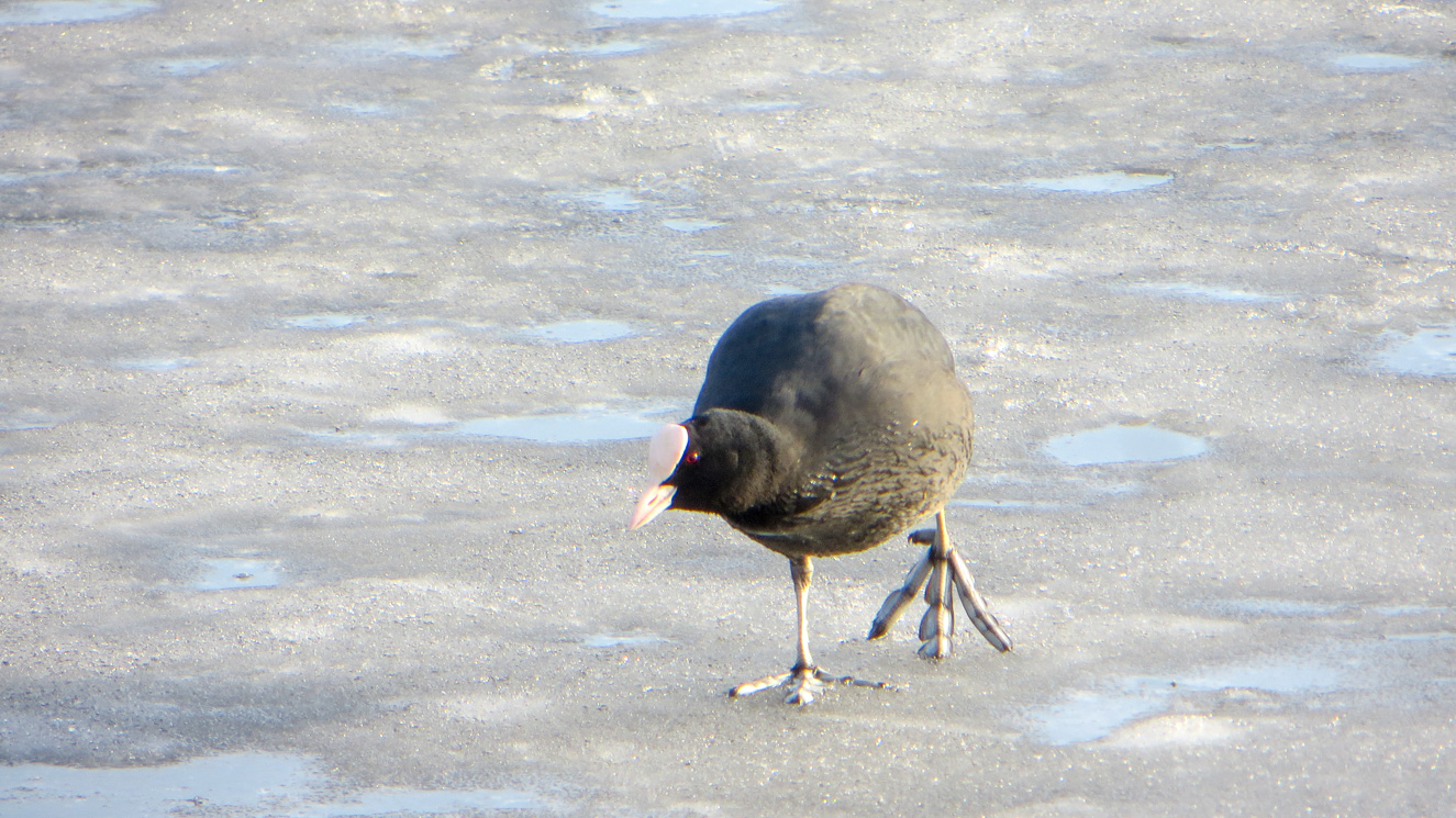 Vi fortsätter till gömslet på Fågeludden och hittar ett bekant ansikte. Titta, där styltar sothönsen! Vad skojigt! Ovana att se hönsen någon annanstans än simmandes, blir vi fulla i skratt över fågelns lustiga gång över isen. Men sötnos, kan du inte ta det lite lugnt när du raskar över isen, du halkar ju hela tiden!