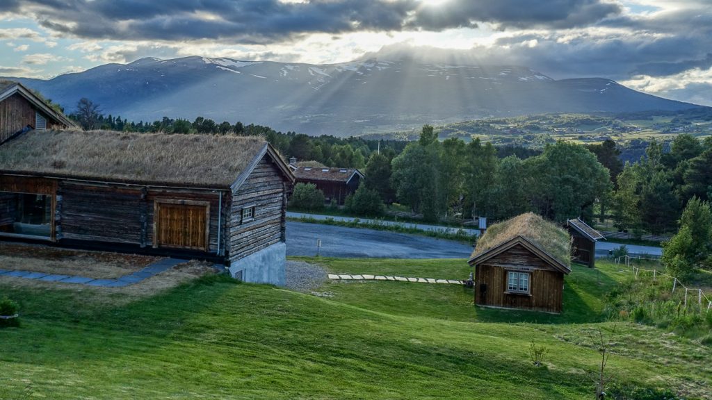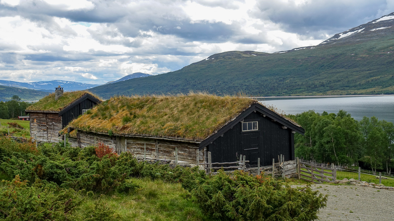 Dessa traditionella hus med torvtak passeras vid en vandring runt Gjevillvatnet. Bättre omgivning för en vandring får man leta efter.