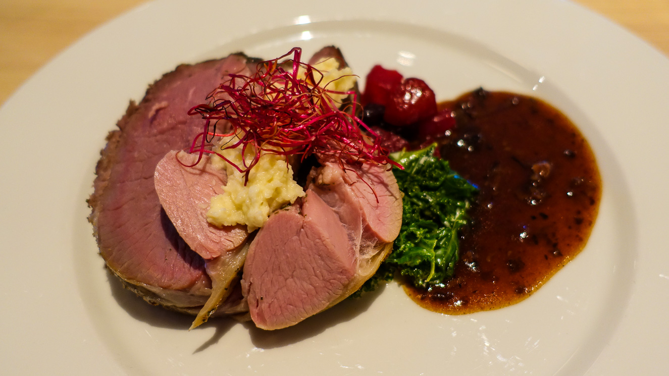 En utmärkt jordärtskockssoppa med pilgrimsmussla och fiskrom till förrätt. Sedan kom den riktiga höjdaren: lammlår från lamm från orten som har rökts på egna gården här. Till det ugnsbakade rotfrukter, krämig grönkål, selleripuré, rödvinssås och ugnsbakad mandelpotatis från Oppdal. Lika vacker som läcker anrättning, utan tvekan en av de bästa lammrätter jag har ätit.