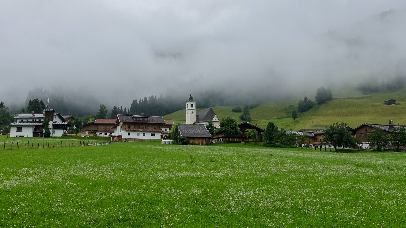 Förvisso hänger molnen tunga, men detta hindrar inte ett besök i Brixen im Thale för att få en glimt av kyrkan. Är den inte fin?