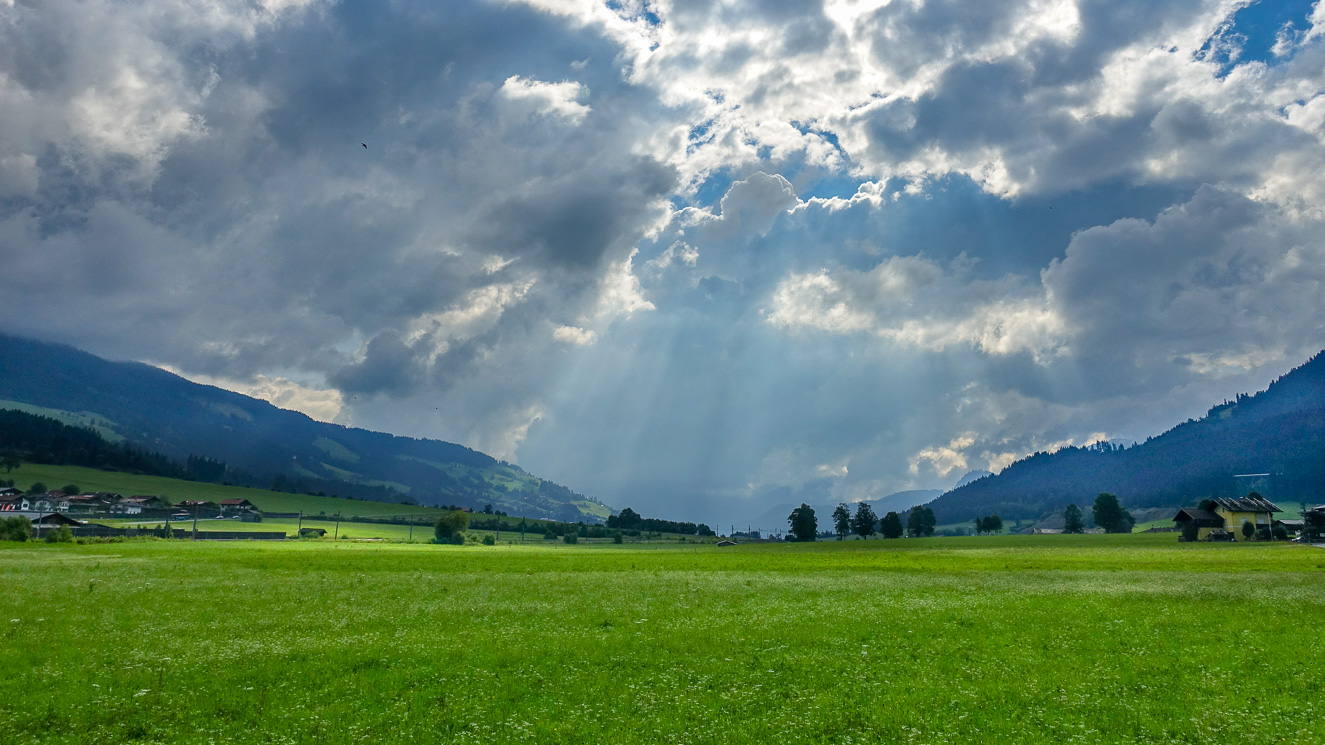 Ut ur Kirchberg i riktning Brixen. Lättgången vandring på asfaltväg genom grönskande ängar och fina hus. Kyrkan i Brixen är fin den med. Någonstans där slutade det att regna och vi upptäckte tjusningen med molnigt väder: gott om vackra moln att beundra!
