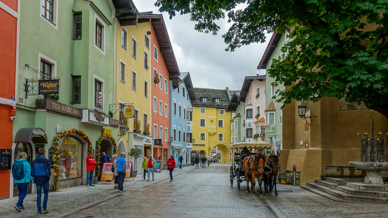 Alldeles oavsett väder kan fashionabla Kitzbühel besökas och kanske kan även en tur med häst och vagn locka. Vagnen har ju tak, förstås.