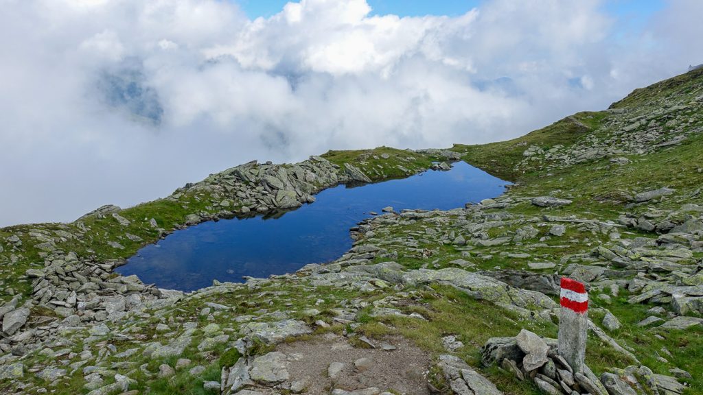 Vid en korsning bestämmer vi oss för att inte fortsätta mot sjön Unterer Bockhartsee som planerat, utan vid en vägkorsning viker vi av mot Bockhartscharte. Om det finns någon tanke bakom denna ändring så är den att komma högre upp – i from förhoppning om att dimman lättar ytterligare och fina vyer över både sjön och höga berg.