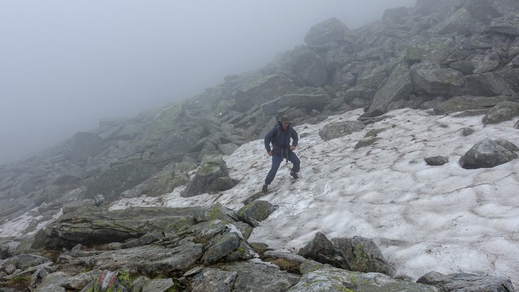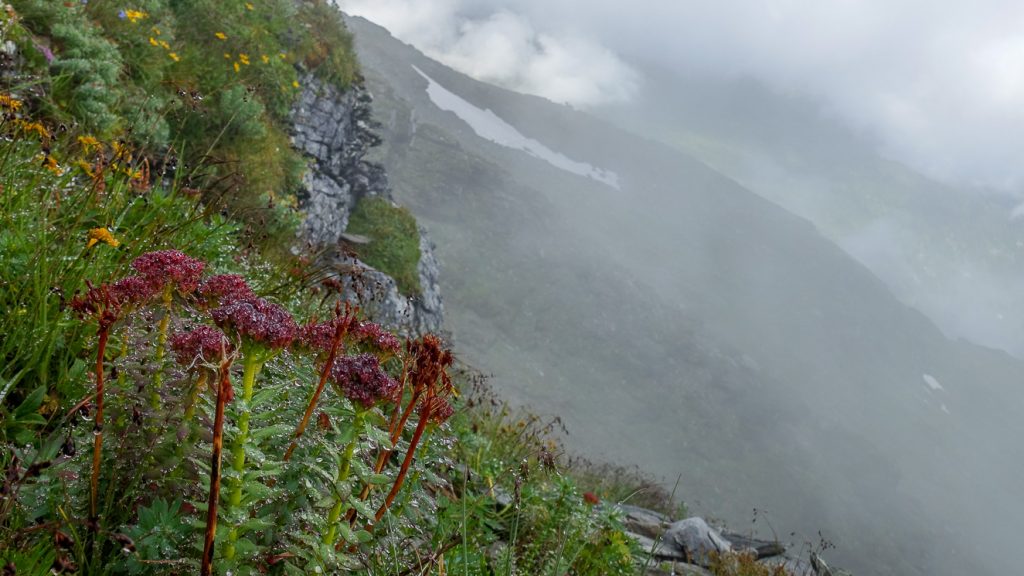 Går till nästa topp. En vajer att hålla i ner i dimman, svindelkänsliga kan tänkas ta det piano här. Ett stenlandskap med limegrön lavklädda stenar öppnar sig – så långt dimman tillåter. Emellanåt ekar murmeldjurs gälla varningsläte i dimman. Ett slags giganterna kamp pågår. Dimman mot solen. Men vad nu! En glipa mot en snöklädd alptopp där! Och en frodig dal här! Vi börjar vädra morgonluft.