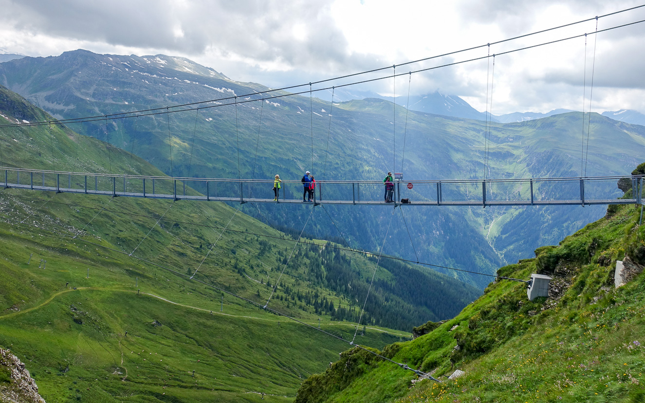 Tanken kabinbanan från Bad Gastein. Vid mellanstationen kommer vi över trädgränsen och sikten blir mer öppen, men vi åker ända upp. Vi ska ända till Stubnerkogel på 2 246 meters höjd för en panoramavandring längs kammen. Härifrån ska man kunna se eliten av de österrikiska alperna. Molnen är så tjocka däruppe att vi är glada för att vi kan se varandra. Vi kan även glädjas åt ängen som bländar med blomprakt. Prognosen har lovat sol.