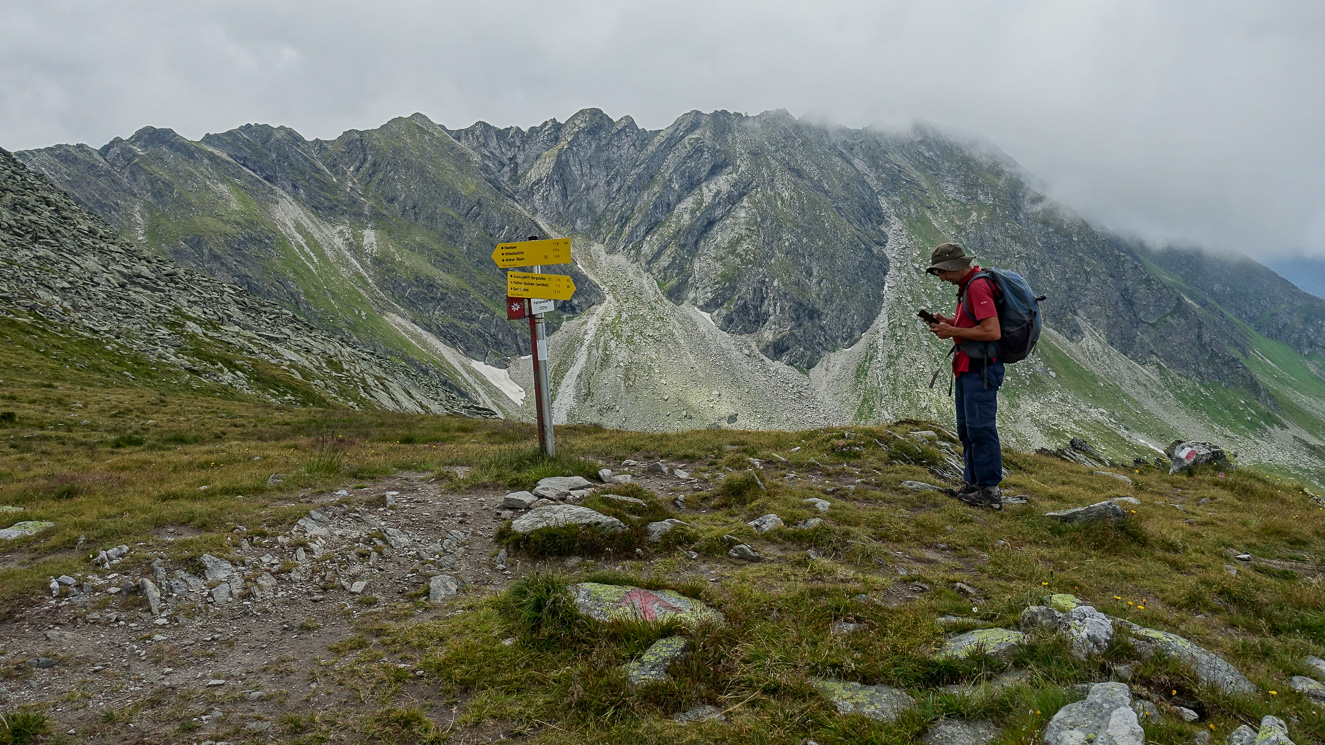En falk svävar ovanför, inte en människa i närheten. Vi och Mordor. Magiskt när dimman stiger och molnen blir allt tätare. Det duggar. Försiktigt skyndar vi oss neråt genom hala stenar och grenar. Denna krävande parering kallar vi mindfulness-sträcka. Runt oss finns både cembratall,  lärk, blåbärsris och alprosor. Men vi måste koncentrera oss på nästa steg, ibland behöver vi både händer och fötter för att ta oss ner för stenarna.