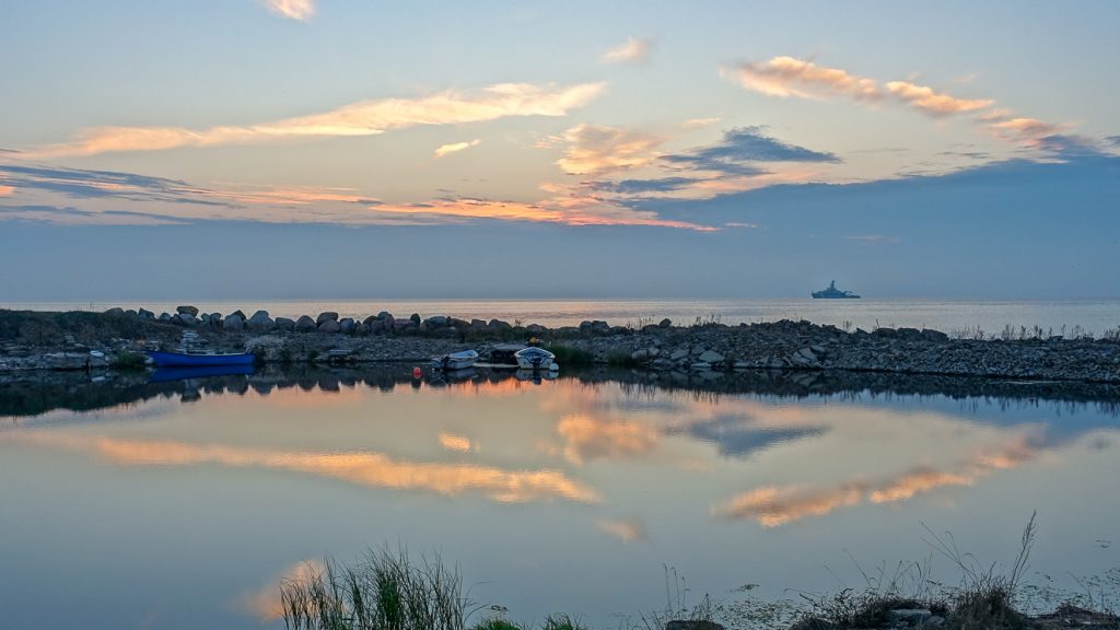 Vi ställer “vår” California Ocean vid Grönhögens gästhamn direkt vid havet. Under vår promenad visar sig ett omfattande fågelliv. En falk ryttlar och dyker ner för att försvinna i väg utan att visa upp bytet. Vi tar en promenad sen eftermiddag och inandas sensommarens klara luft. Till vänster Östersjön och på högersidan en damm bräddfylld av fågelliv: sothöns, knölsvanar, grå svanungar bredvid, svalor och änder, mås. Det är livat.