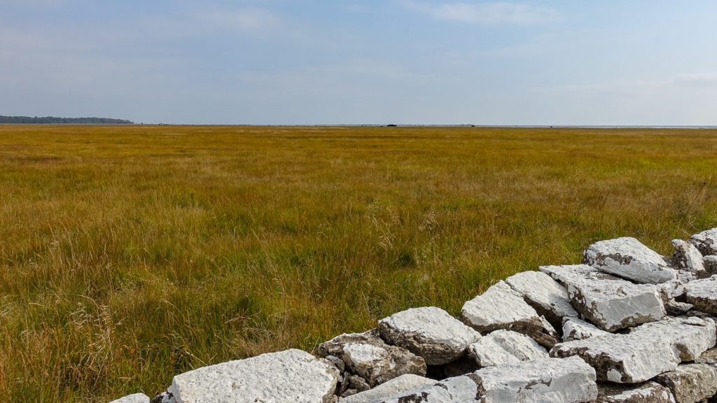 Nu blir det lugna puckar. Vi knallar på en lång spång till det så kallade vindskyddet vid havet. Från skyddets gistna bänk kikar vi mot sandreveln en bit ut och siktar en storspov.
