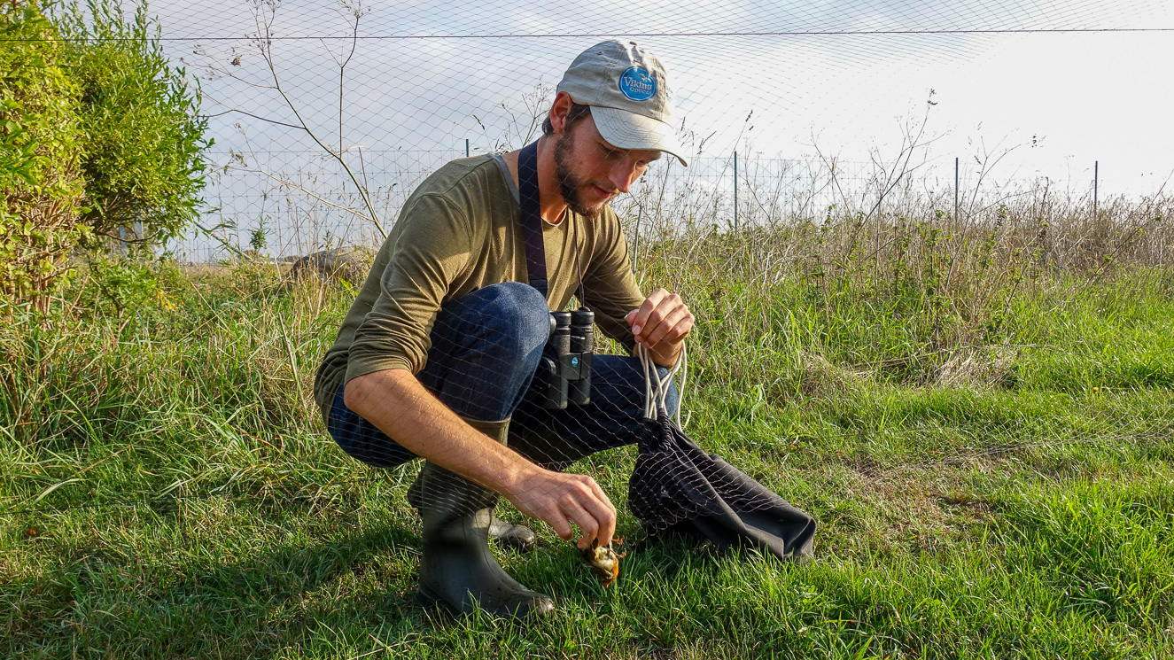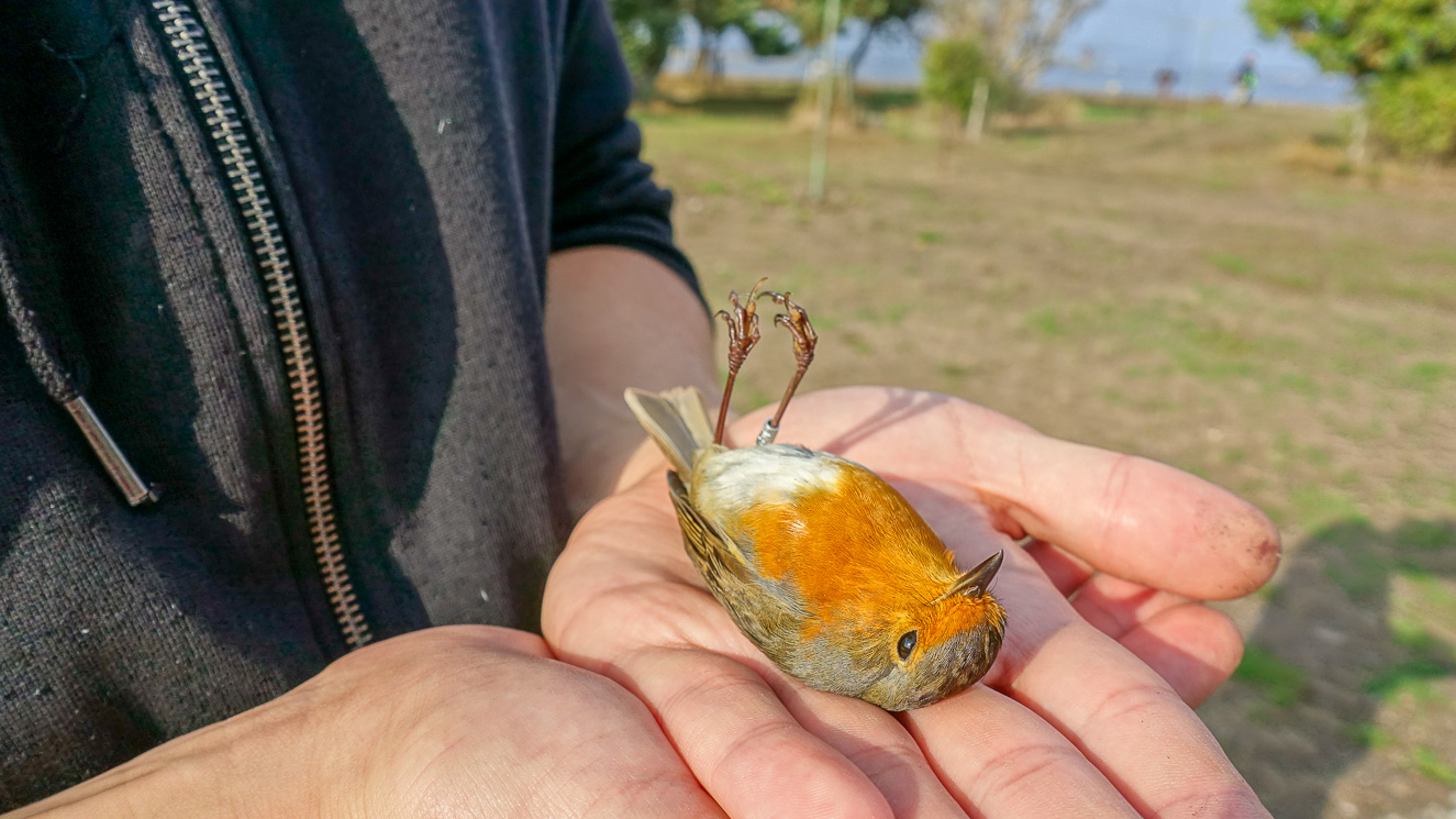 Nu är klockan halv nio och en fågel med en rödorange mage har distraherats av ljudet och fastnat i nätet. Sam från Storbritannien vittjar nätet och han tycks göra det med van hand. För att lösgöra fågeln så skonsamt som möjligt befriar han kroppsdelarna i samma ordning som de fastnat i nätet.