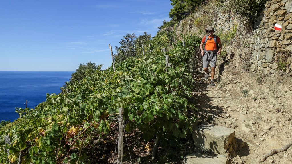 Det luktar fikon i uppförsbacken – som en uppmuntrande heja. Vi går flankerade av stenväggar mellan gårdar. Snart nog öppnar sig en panoramavy över vinrankor och Medelhavet. Vi tar en paus på några stenar och dukar upp matsäcken: focaccia pomodoro och vanlig focaccia – direkt från bagaren.