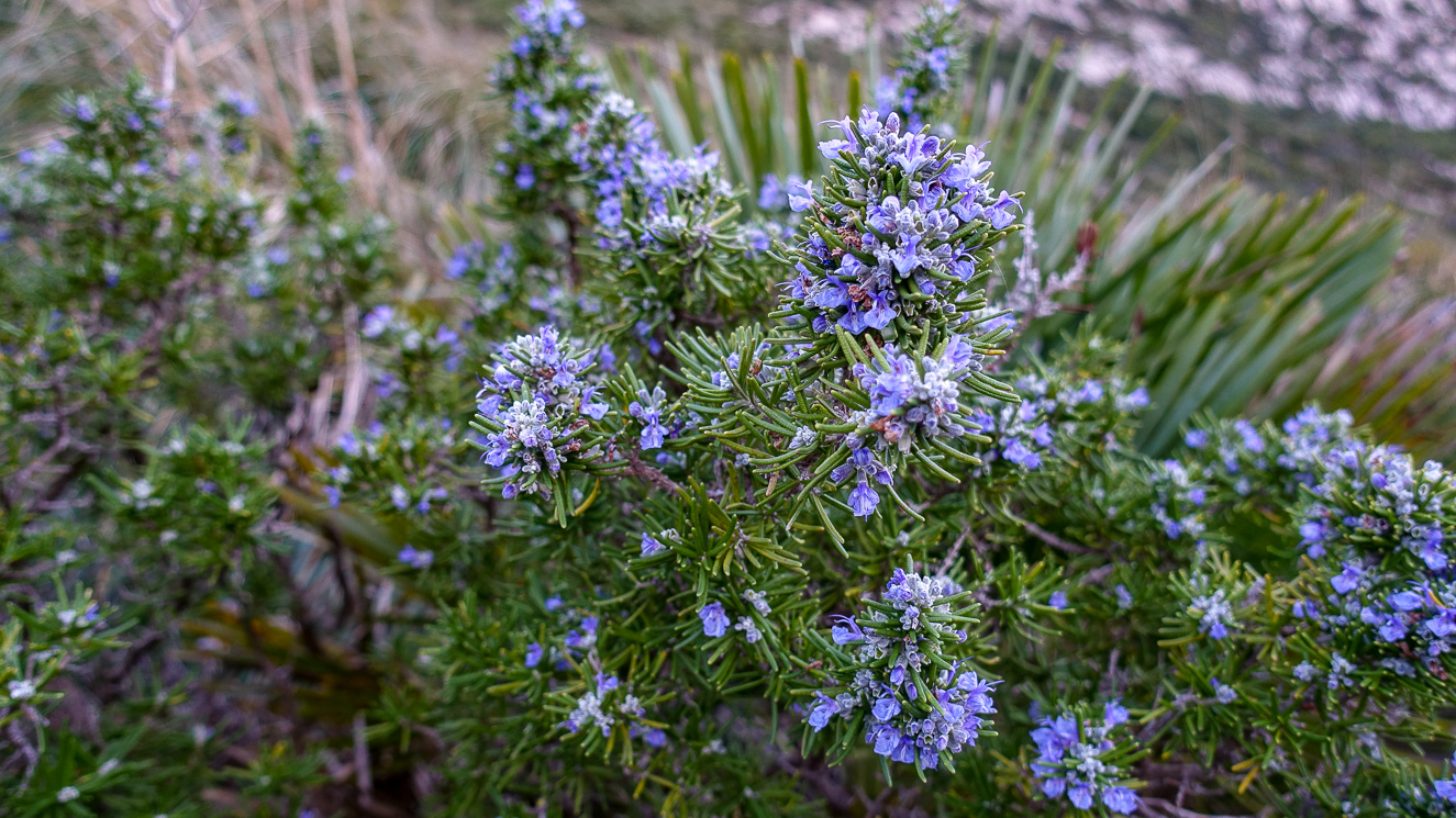 Vägen till Rosmarindalen går genom en olåst liten grind i en större grind, en gård och en klurig grind. Sedan är du i en dal, omgiven av klippor och dvärgpalmer. På lite längre håll ståtar Tramuntana med Mallorcas tredje högsta topp Tomir. Nu blir det mer busklandskap och det sjuder av fågelliv, övervägande småfåglar. Och gissa vad, Rosmarindalen bågnar av vilt växande rosmarinbuskar. Doften är förförisk.