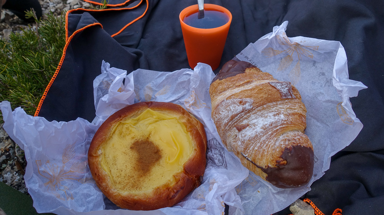 Det gör vi också. På dessa svindlande höjder hittar vi en smal klippa omgiven av höga klippor och utsikt som tar andan ur en. Picknicken dukas upp och bortsett från några svenskar som passerar förbi är det både stilla och vindstilla. När vintersolen tittar fram ur ett passerande molntäcke är det ytterst behagligt. Måltiden avslutas med vaniljbulle med kanel på och en chokladbulle som smakar himmel. En av de bästa picknickar vi har upplevt.