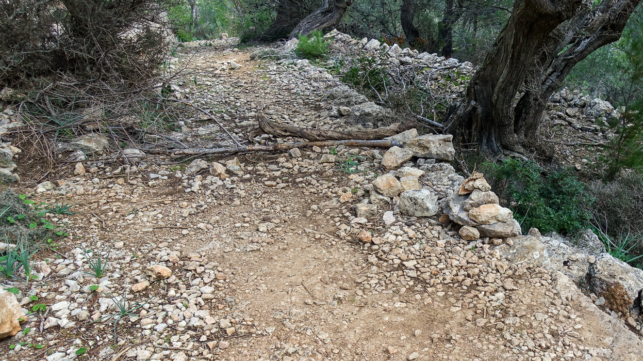 Vi följer en liten röd pil (till vänster) och går på stenlagda serpentiner vid sidan av terrasserade odlingar – kulturlandskap som utgör en del av Unescos världskulturarv i Tramuntana. Havet skymtar på håll mellan de omgivande buskarna och ljung. Tallarna är nog unga, små är de i varje fall. Nu i stället resliga tallar och urgamla olivträd, antagligen från en gammal odling. Här syns ännu mer kulturarv: en gammal bevattningskanal, och där en stenmur.