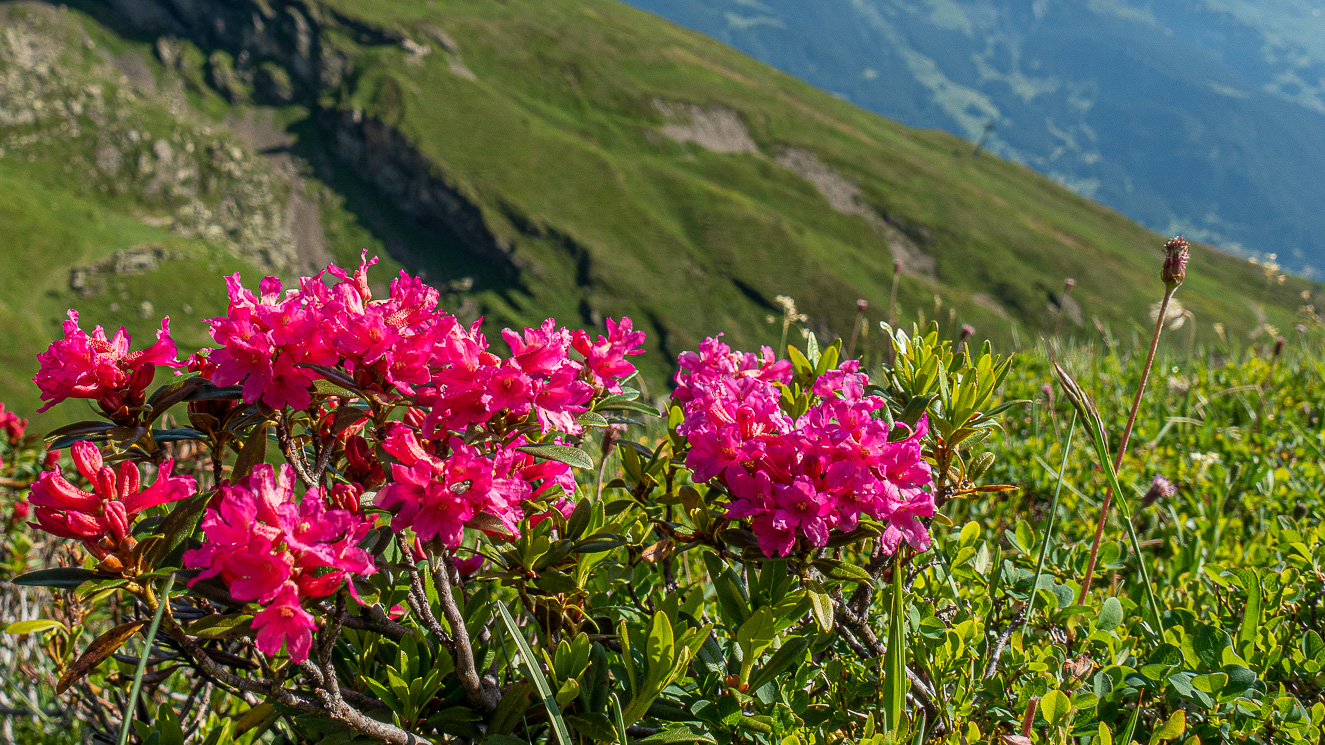 Vi känner oss lite romantiska så vi Romantikweg i riktning mot Alpiglen. Snart tror vi oss förstå namnvalet. Dessa böljande ängar med alpsjöar och göl är bräddfyllda med allsköns alpblommor, inte minst alprosor. Allt inramas med storslagna alper. Alprosor och alper – kan man bli annat än knäsvag?