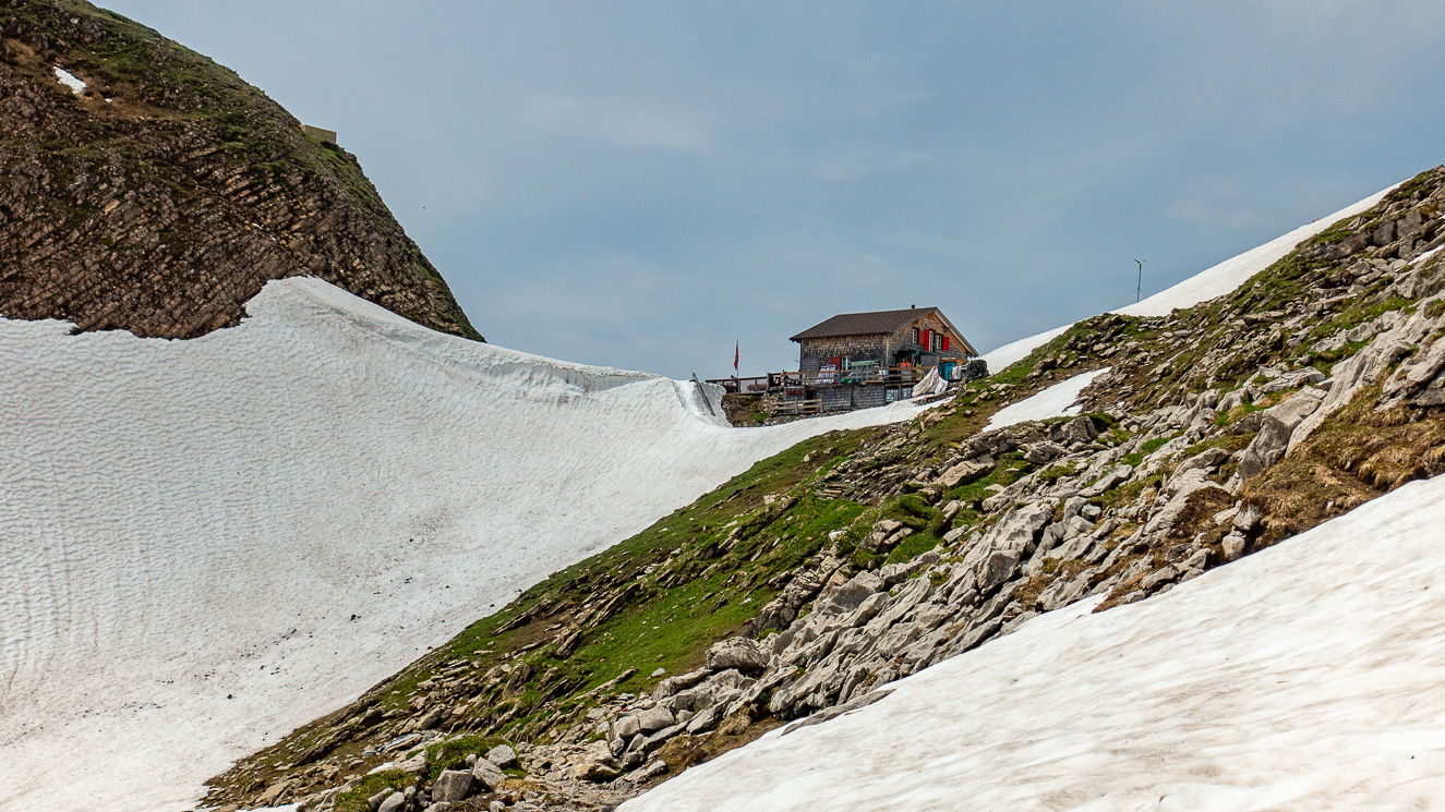 Som belöning tar vi igen oss över en kall Rivella, en mer eller mindre söt läsk, i alpstugan Männdlenen på 2 344 meters höjd. Luften är mättad av bränd ved.