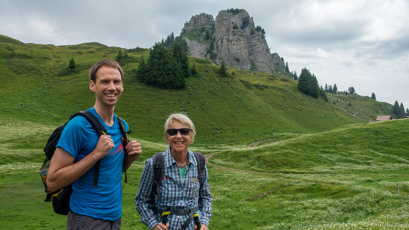 Sandro Mattle, hennes son, är också med på vandringen. Han jobbar i Zürich, men brukar åka till Jungfrau-regionen på helgerna. För att hälsa på mamma och vandra.