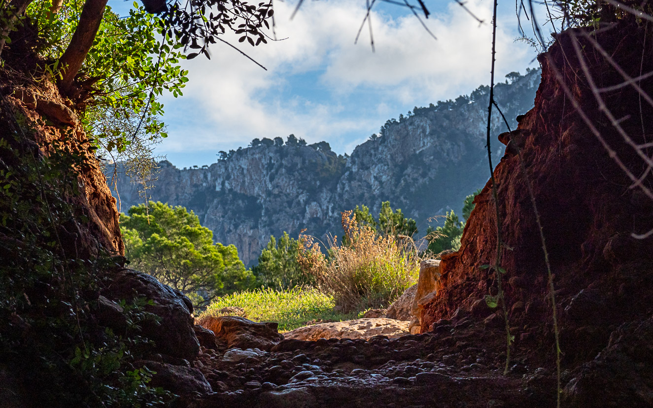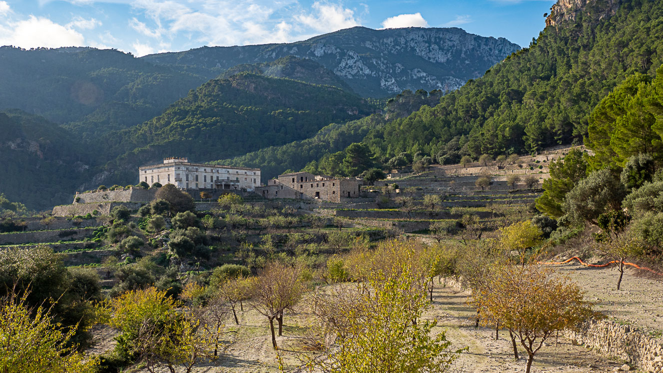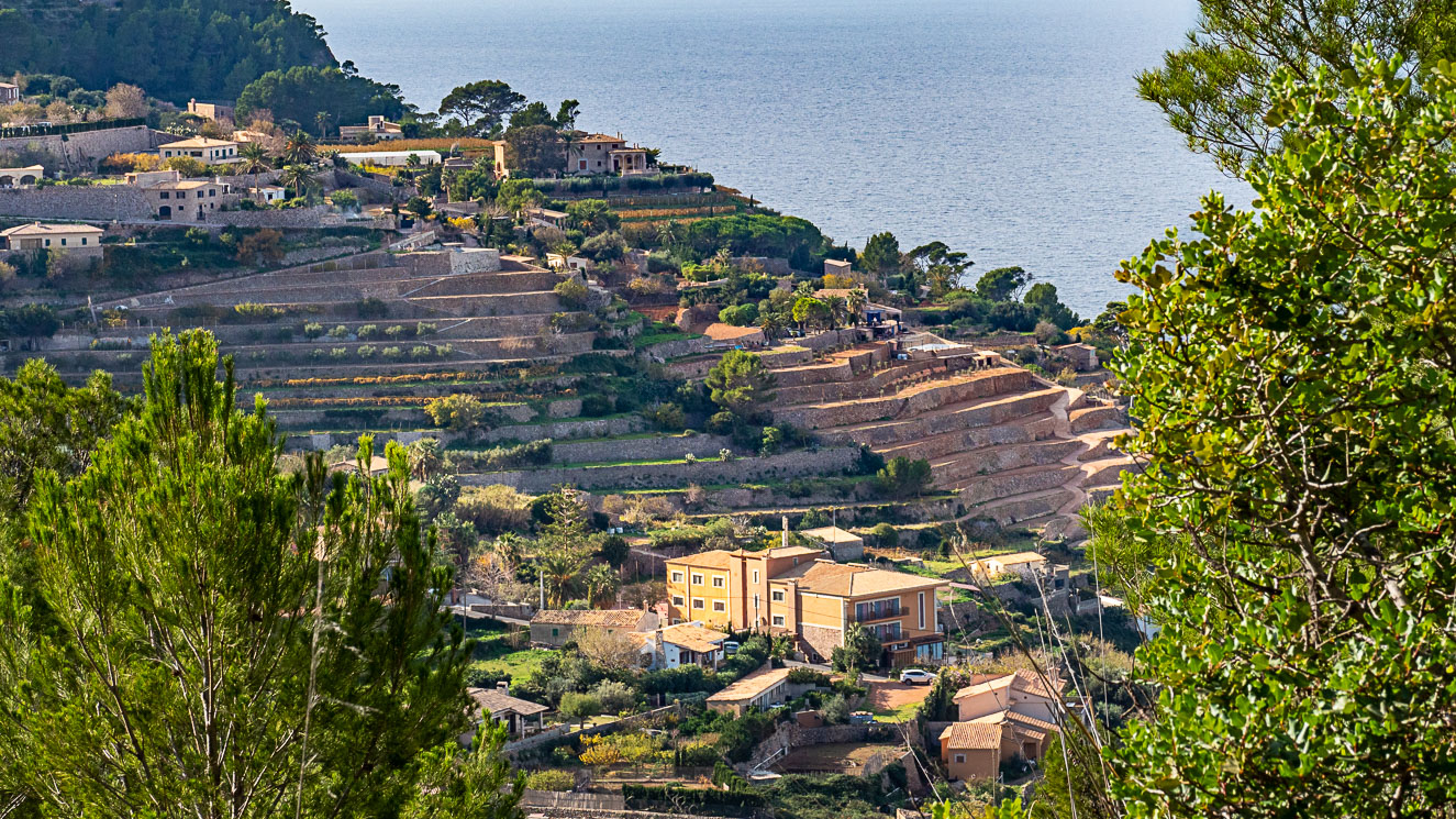 Vinden susar om aleppotallarna och mellan träden skymtar havet. Träden och buskarna utgör hemvist för fåglar vars sång hörs närmast oavbrutet såhär på morgonkvisten. I den frodiga dalen runt byn ligger gårdar med fina stenhus. Alltsammans utgör en del av världskulturarvet Tramuntana, inte minst de välbehållna terrasserade odlingarna.