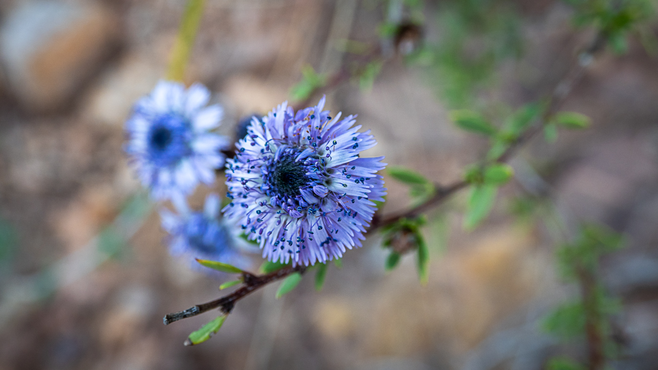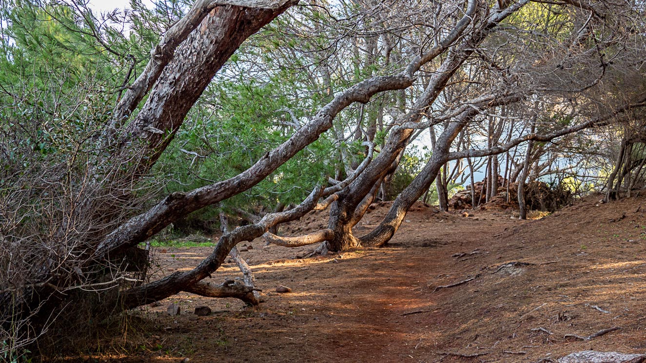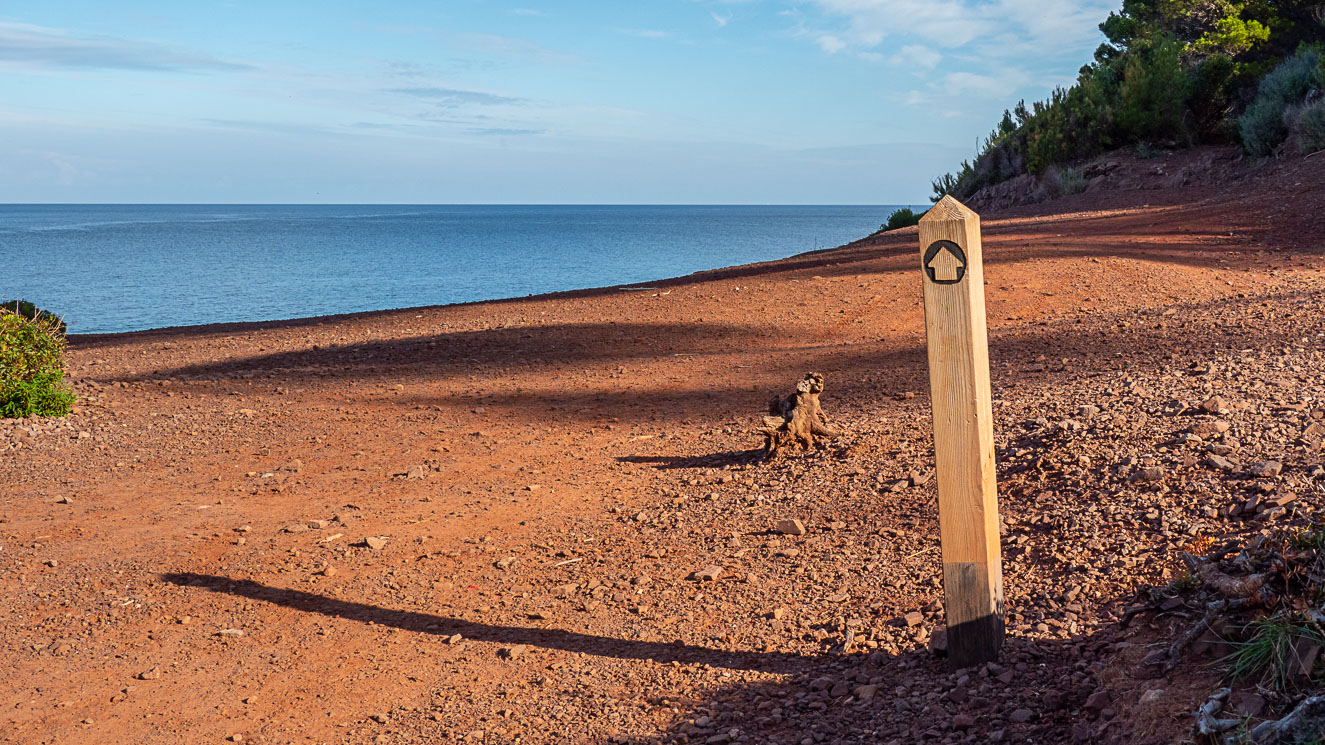 Det är en fröjd att gå längs stigen med lagom lutning och ta in vegetationen som är så typisk för Mallorca och Medelhavet. Gott om stenekar och stenar. Det tåliga gräset càrritx som finns främst på Mallorca. Rosa blommande ljung. Buske med röda och svarta bär. Smultronträd med röda och orange bär som jag alltid blir glad av att se. Johannesbrödträd med de säregna, krokiga svarta frukterna. Jag gnuggar händerna mot en rosmarinbuske, doften är nästan som lyckopiller.