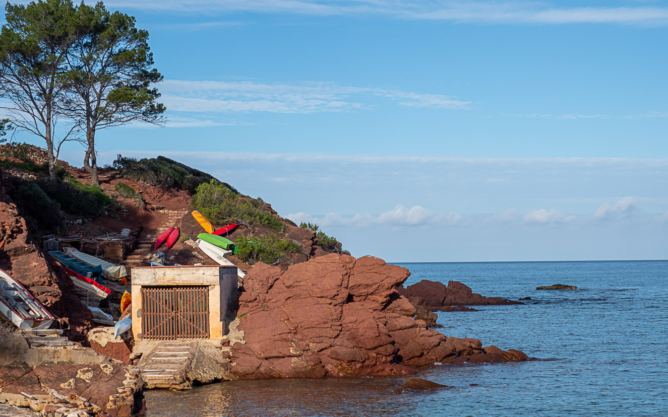 Passerar stranden och därifrån uppför stigen där havet och de dramatiska klipporna visar upp sig i all dess härlighet. Här finns gott om förträffliga platser för picknick under bar himmel eller någon av de magnifika aleppotallarna, om skugga önskas. Men ännu är det för tidig för lunch så vi går vidare genom en mindre ravin och är snart framme i hamnen i byn Port des Canonge.