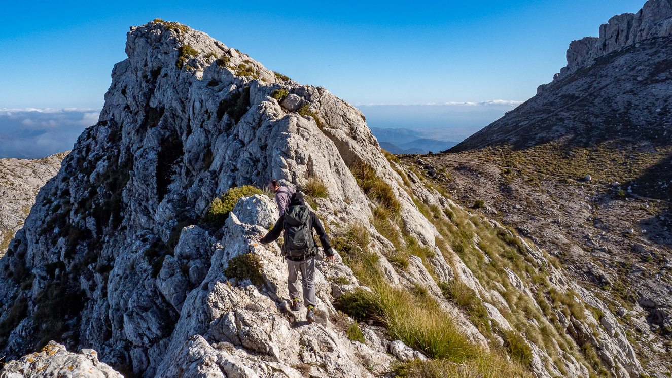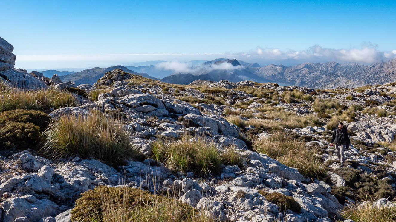 Vägen till nästa topp går genom ett pass och vidunderliga utsikter över Tramuntana-bergen. Hoppar mellan stenar och klippor och snart är vi där uppe på nästa topp – Serra des Teixos W.