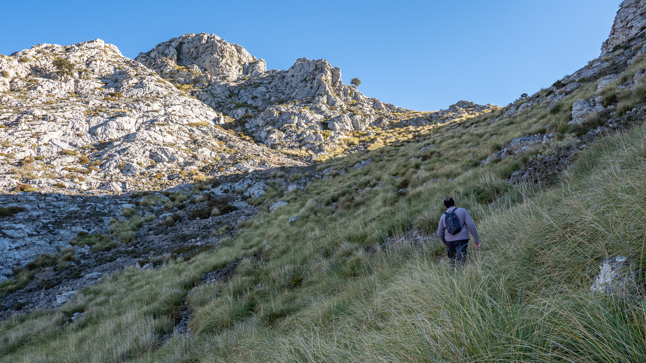 Inte ens Xavier är tvärsäker över vägen och någon stig finns inte. Vi är i ett stiglöst land. Vi delar på oss och efter en stund ropar han från en klippa ovanför oss. Klättrar över en av världskulturarvet Tramuntanas otaliga gränsmurar och hittar något som liknar ett mindre stenröse mitt i det karga landskapet med stenar, macchiavegetation och mängder av càrritx, det långväxande och tåliga mallorkinska gräset. Gräset breder ut sig överallt och kan vara både en förbannelse och en välsignelse. Det är lätt att fastna i gräset och tappa fotfästet bland stenarna, men det går också att hålla i det för att ta sig upp eller ner i en sluttning. Som nu när vi måste klättra upp. Då gäller det att ta i en hel näve grässtrån, enskilda strån kan man skära sig på.