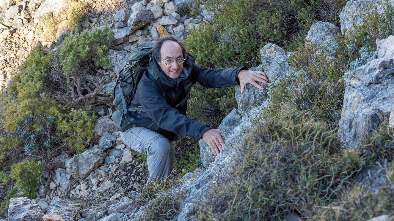 Eyal på väg uppåt under mastodontvandringen till tre toppar över 1 000 meter i Serra des Teixos i Tramuntana.