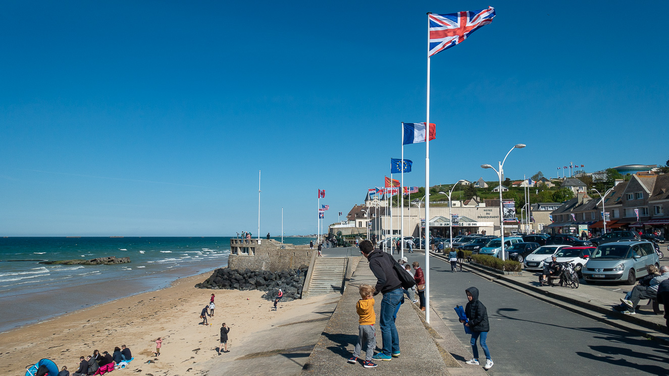 Flaggorna vajar vid Arromanches nära Gold Beach. Här skapade de allierade en konstgjord hamn.