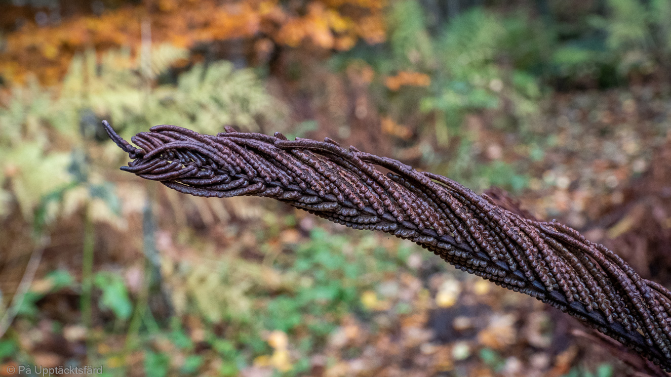 Anteckningarna: “Delvis översvämmat i Klövåns bäckfåra. På ena sidan är det väldigt brant upp. Ormbunkarna har vissnat mörkbruna som en förberedelse inför ett vinteride. Vattnet strömmar i bäcken. Bredvid rasbranter med mossklädda stenar. Vi lämnar ravinen och fortsätter rundvandringen uppför en backe på en matta av brungyllene blad genom en bokskog.”