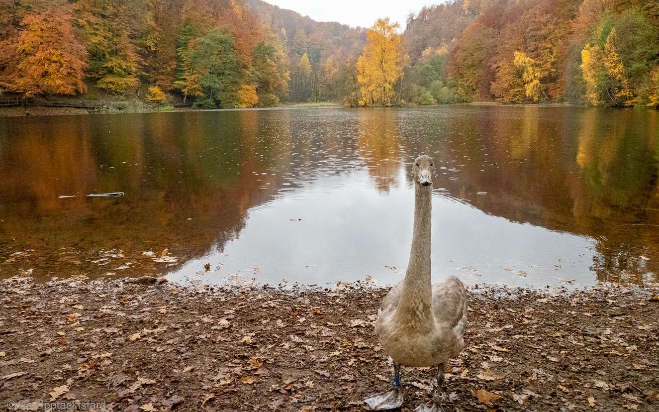 Luften är krispig. Morgondimman dröjer sig ännu över Skärdammen, där träd speglar sig i nyanser av gult och rött. En strömstare står vid en porlande bäck och flyger snart iväg snabbare än kvicksilver. En sångsvansunge i grå fjäderdräkt närmar sig oss stegvis. Den är helt oskygg. Just denna svanunge får vi anledning att återkomma till, senare.