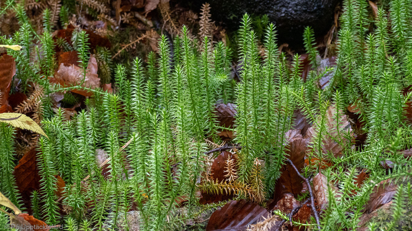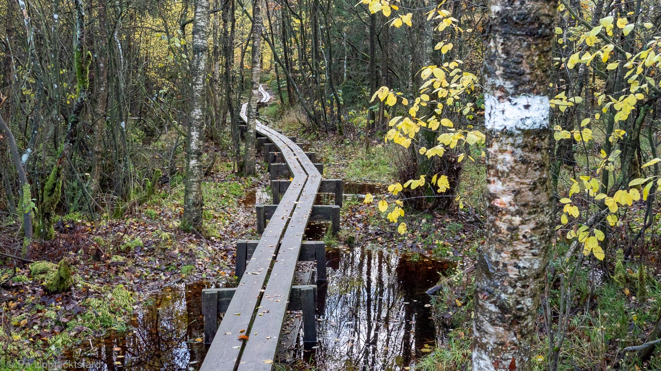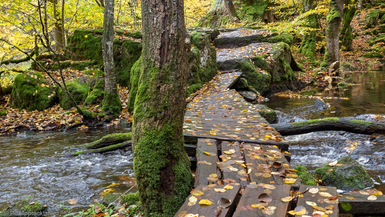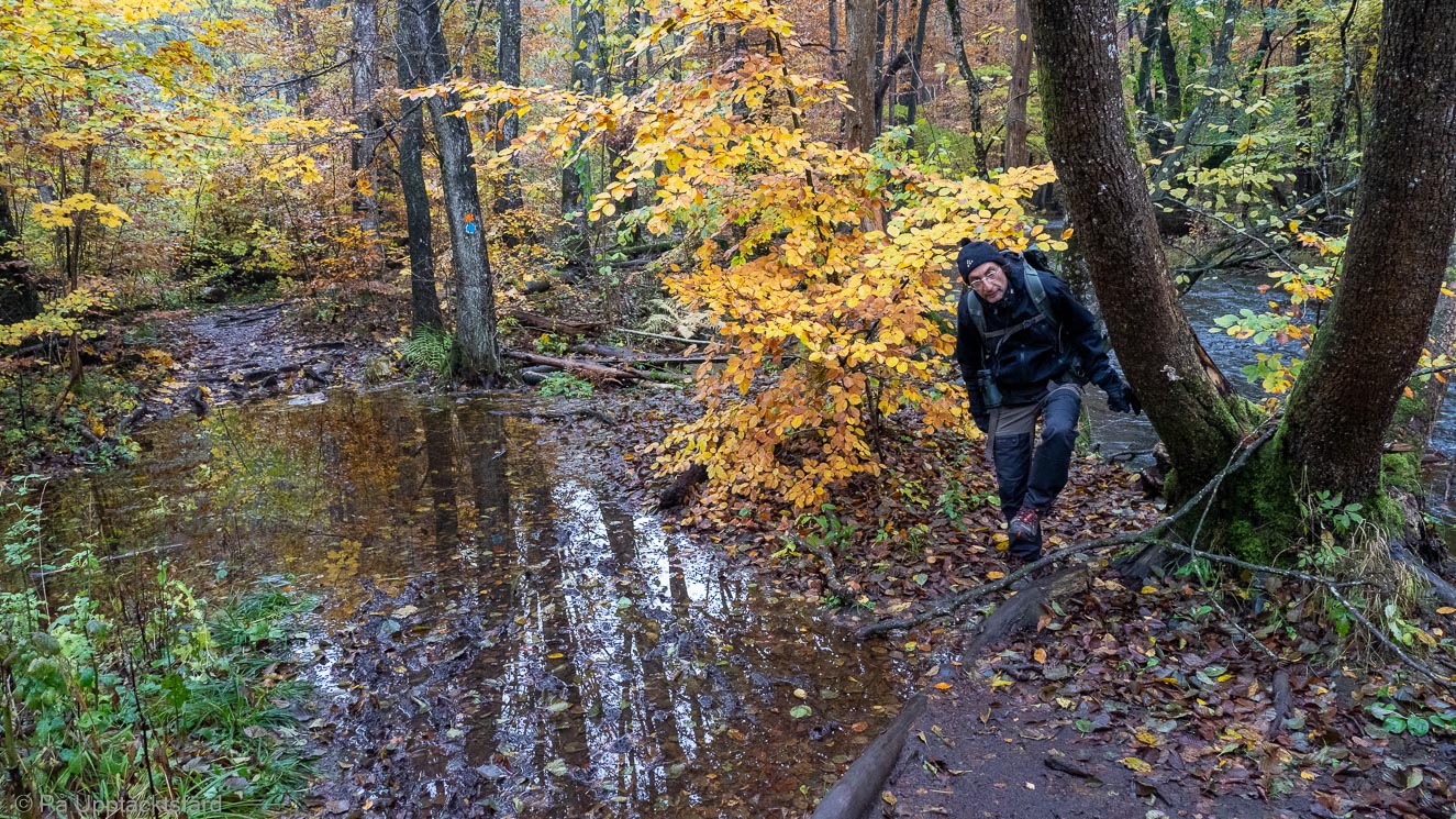 Här och var är det lite kletigt utmed ån, fötterna sviktar på det mjuka underlaget, ibland väl mycket – min högra sko tar in vatten. Revlummer står raka som tennsoldater. I Korsskär går två bäckar ihop och de hala stenarna är dekorerade med gröna blad. Några plankor till träbro leder oss över den strömmande ån i en tystare värld. Det enda som hörs är ljudet av ekorrens klapprande fötter på en nedfallen bok. Med lite mer ansträngning förnimmer vi det subtila ljudet då fallande löv kysser marken. Puss!