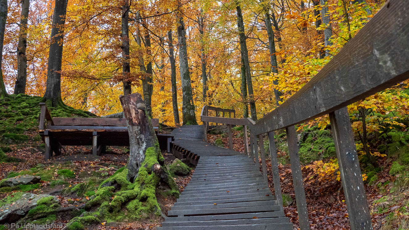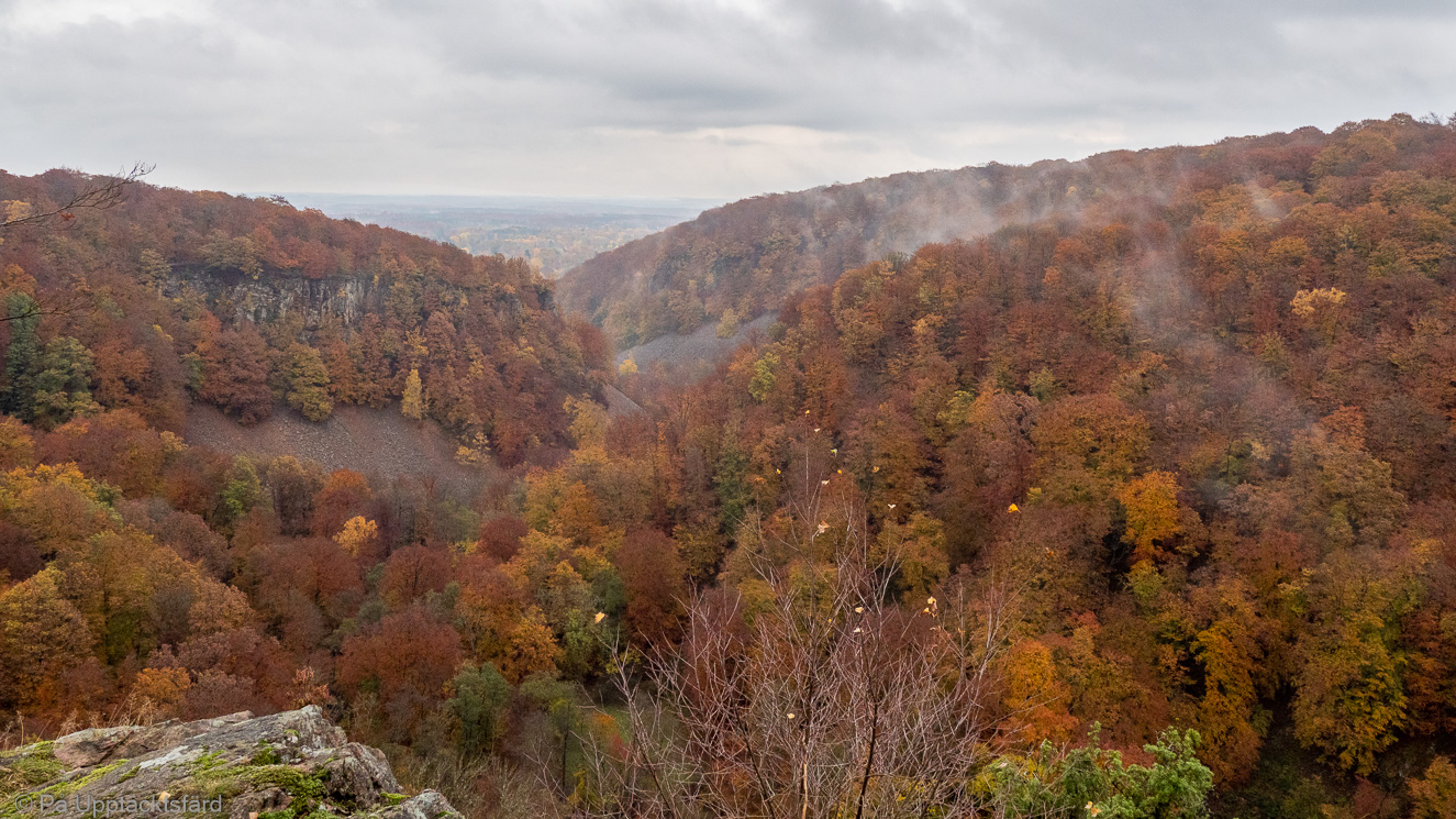 Nu blir det lika brant upp mot Liagården – med porlande ljud från rinnande vatten i öronen. Vidare mot Skäralid på den väl markerade blå stigen. Vi tar in hösten vid utkikspunkten Lierna. Vattnet nere i ravinen ekar. Ändå hör vi hur det krasar om de gyllene bruna löv på väg till Hjortsprånget. Hjortsprånget är Utsiktsplatsen Som Alla tydligen ska köa till för att ta ett Insta-foto. I somras ringlade kön lång så vi hoppade över. Nu är det bara vi här. Platsen utgörs av en spektakulärt smal klippa som sticker ut mot ravinen på svindlande höjder. Utsikten är dock inte så bred som på flera andra ställen.
