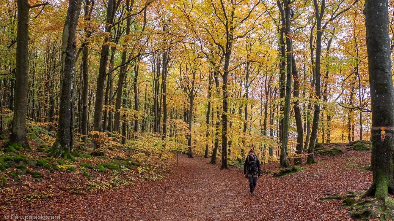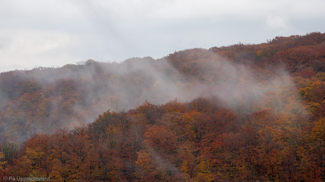 Upp för trapporna mot utkikspunkten Kopparhatten på en bädd av krasade löv i brungyllene nyanser. De resliga bokarna sträcker sig över oss, med lövverk skiftande från blekgrön till rostbrun, i ett slags katedral: Naturens överväldigande katedral. Vi kastar en förstulen blick ner över rasbranterna på andra sidan, över nejden långt utanför Söderåsen och över trädkronornas väldiga gyllenebruna täckte långt ner för stupet. Nu förstår vi Söderåsens hemlighet.