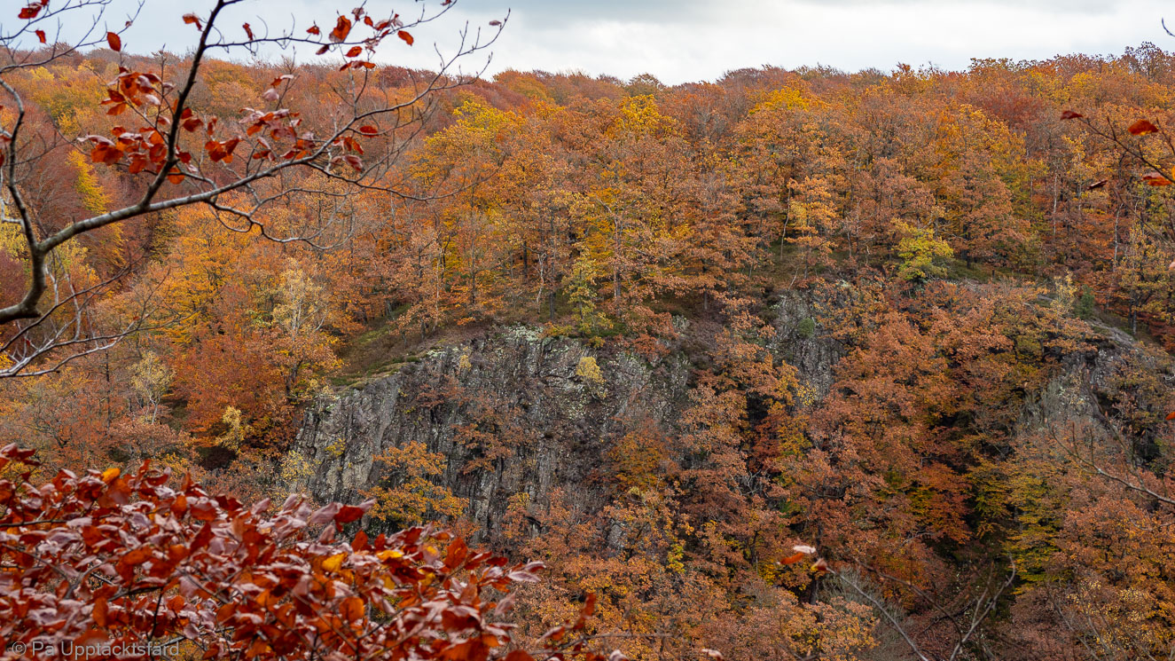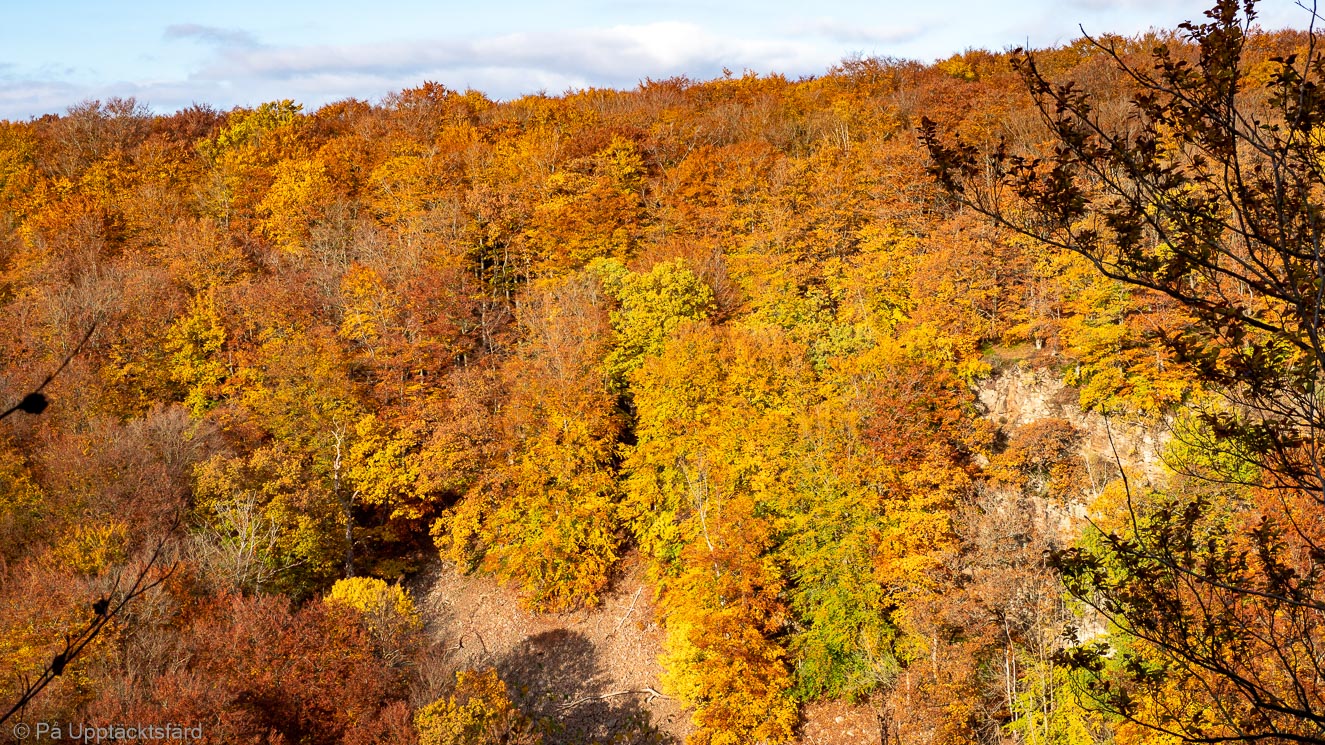 Ur anteckningarna på fältet: “Långt ner i ravinen bär träden höstskrud. Vi står nära stupet och andas djupt medan vi tar in hösten och den dramatiska utsikten. Stupet! Ravinen! Allt medan bruna boklöv yr i luften. När solen bryter igenom för en liten stund lyser bladverken upp. Magi!”