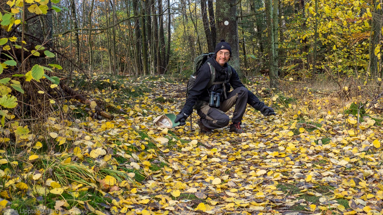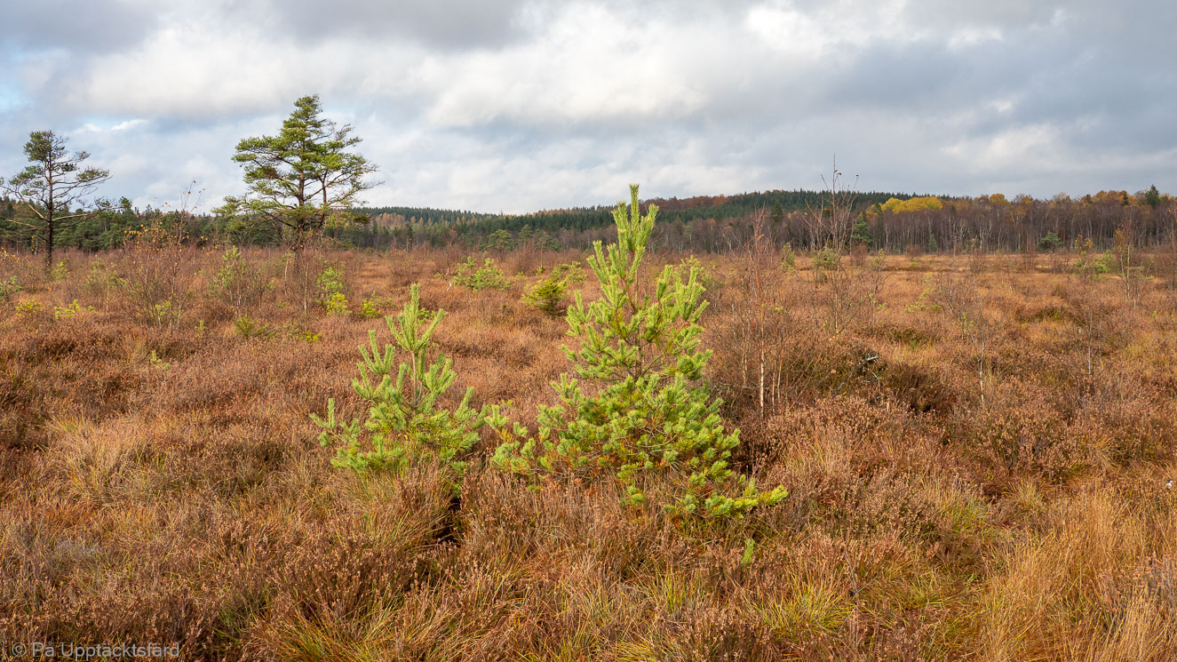 Ett utdrag ur mina anteckningar på fältet: “Luften vibrerar av asplöv. Längs en stig med gulnande asplöv och sen på lövklädda spänger som aldrig tycks ta slut. Under och bredvid spängerna är fullt av vatten. Björkarna och en del buskar är redan avlövade. Spången har visst en ände och vi står på ett slags plattform där vi siktade tranor i somras. Nu bjuder plattformen på komplett stillhet. Den stora världens vedermödor och kriser känns fjärran.