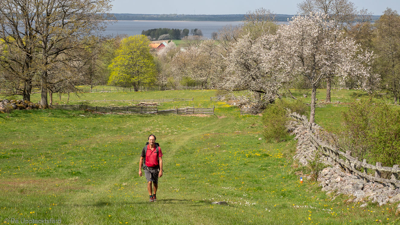 Från Gudhem tar vi en grusväg med gårdar som fortfarande idkar aktivt jordbruk, främst köttbönder. Rum efter rum öppnas i det böljande landskapet med maskroskantade betesmarker. Här ett rum med gamla stenmurar. Och här med gammeldags mjölkkanna. Faluröda stugor. Ett vasstak alldeles grönt av mossa. En damm. Körsbärsträd i full blom. Förföriskt doftande hägg. Och är man alldeles tyst hör man binas surr.