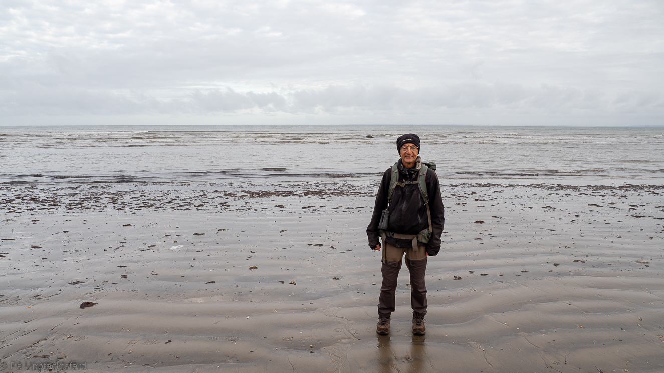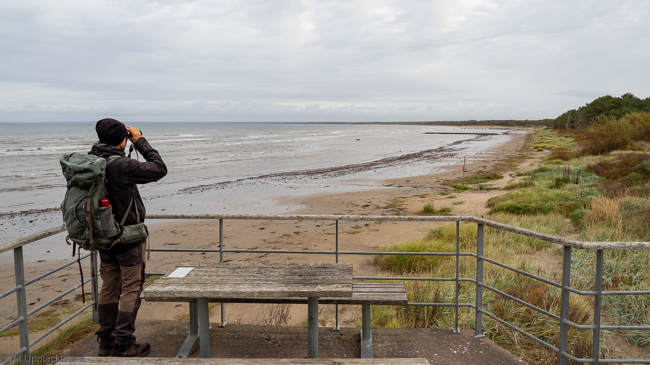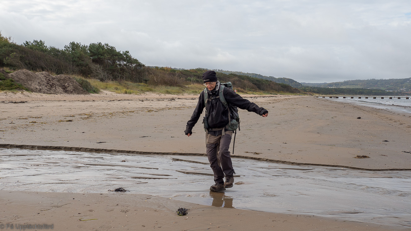 Vad är det för gällt ljud? En spillkråka som varnar i flykt. Åt motsatta hållet, långt ut i havet kryssar två havssulor. Och snart tornar ännu en liten överraskning upp sig på sanden (med betoning på liten): en sandlöpare i dess vinterdräkt. Vilken söt liten vadarfågel!