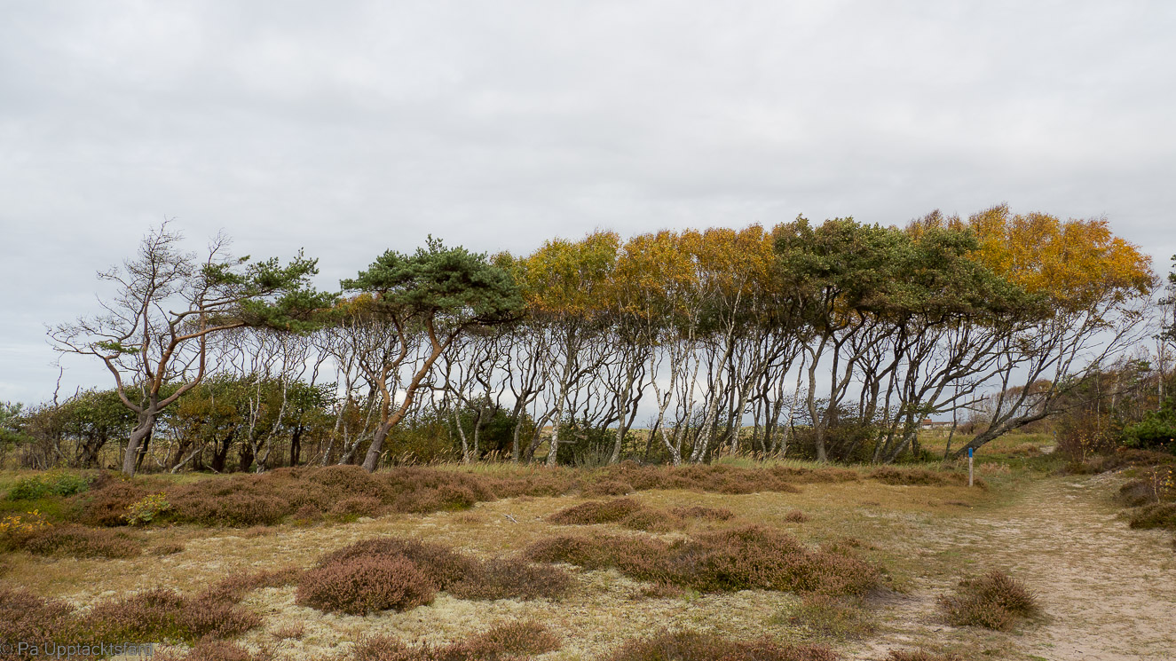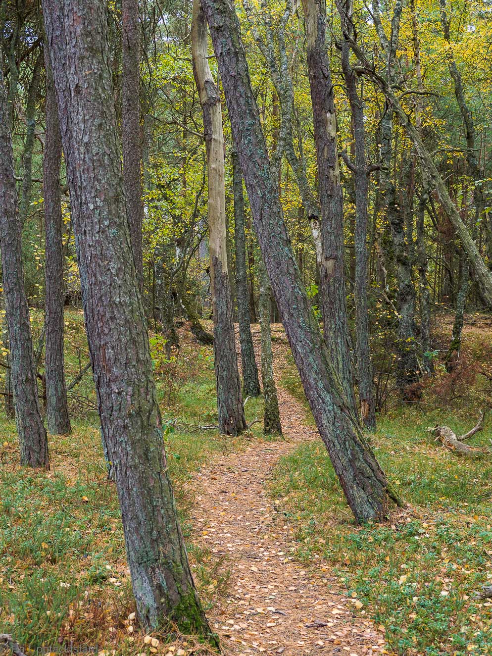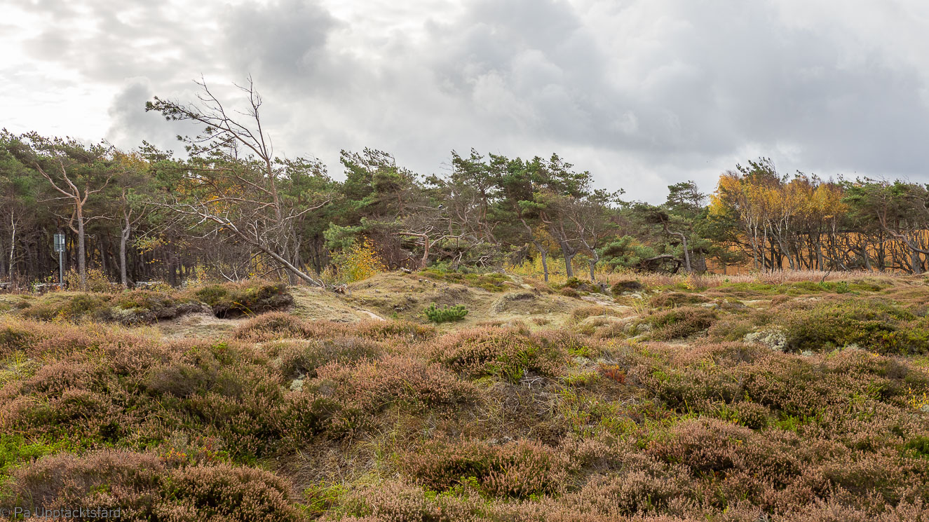 För ett ögonblick lämnar vi denna sköna omgivning med sanddyner och hed och beger oss in i skogen, med tallar, björkar och lite av varje. Det är havsluft, det är fågelljud och det är höstfärger.