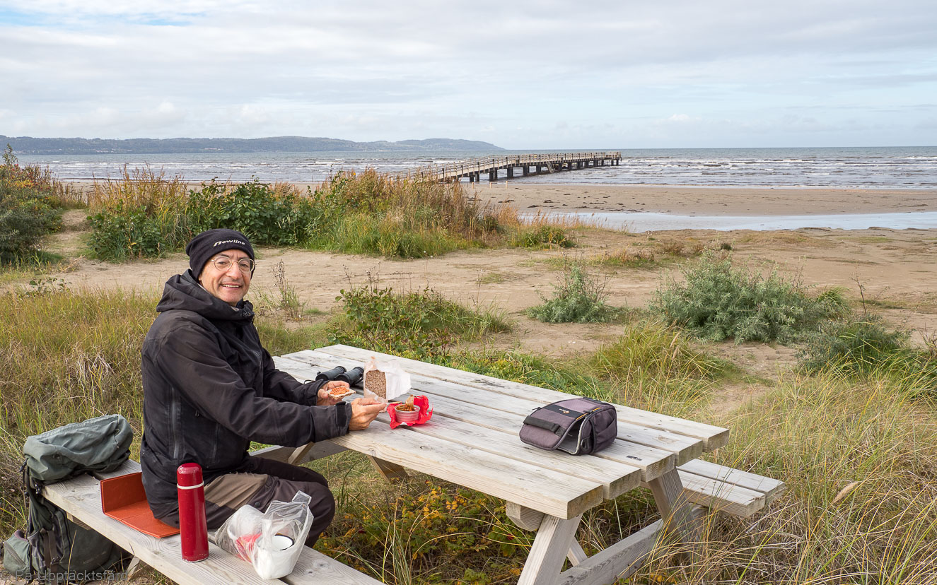 Vi beklagar sorgen, rycker på axlarna och slår oss ner på närmaste bänk med strålande havsutsikt. Ur ryggsäcken dukar vi upp vår vanliga nödproviant vid längre utflykter: knäckebröd, makrill i tomatsås, kaffe och blandade nötter med russin. Inga sura miner och hyggligt mätta blir vi.