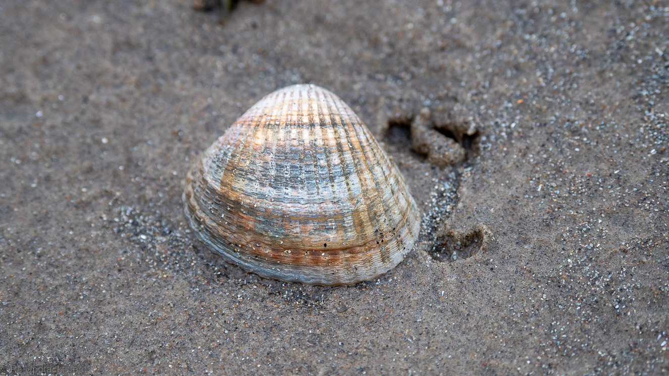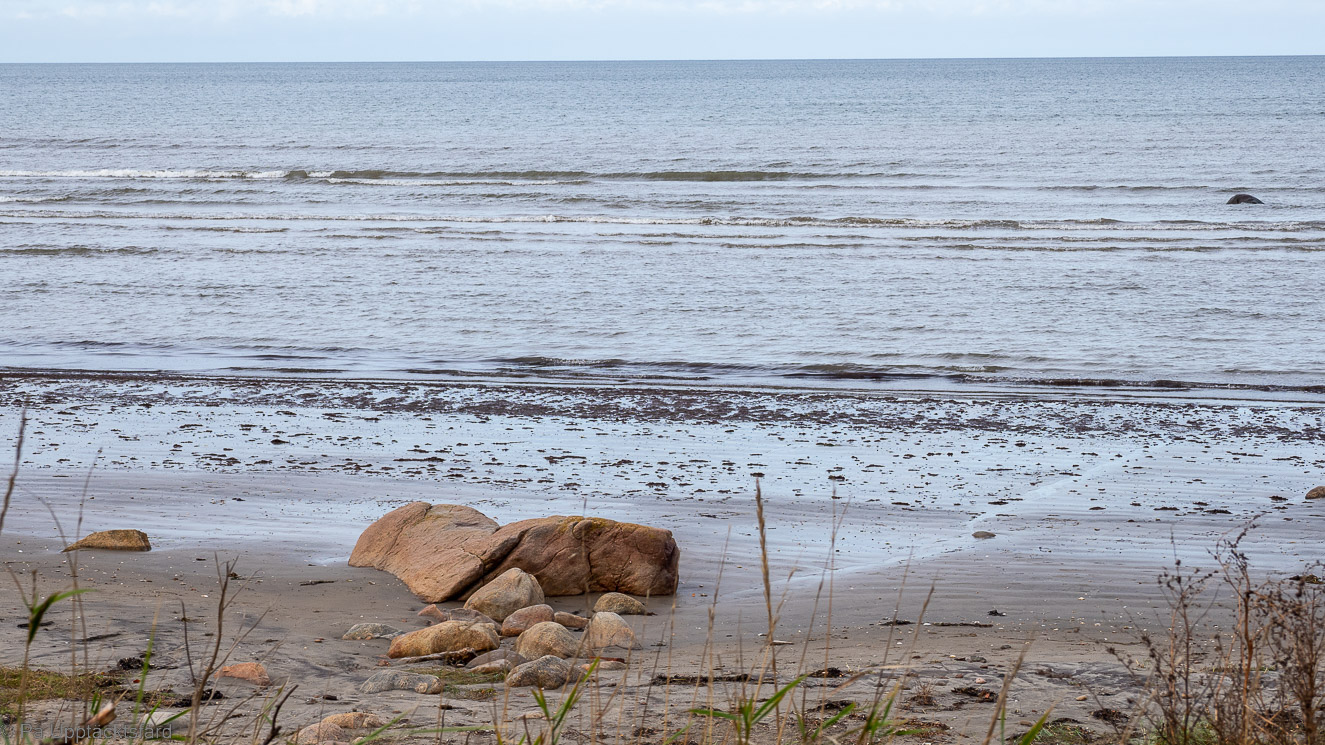 Några steg till och vi befinner oss på något annat än sandstrand, det märker vi: sanden är blöt. Vi går på havsbotten. Det märks också på alla strandfynd. Ostron (var är närmaste champagnebar?). Små och stora maneter. Oändligt med snäckskal. Tång. Allt till inramningen av en oändlig horisont.