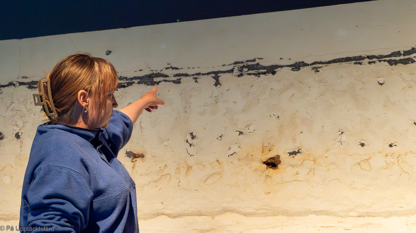 Fiskleran på Stevns Klint Experience är ett några centimeter brett grått lager mer eller mindre mitt i ett 33 ton tungt stenblock. Med handen på hjärtat, fisklerans utseende är inte så uppseendeväckande. Ändå får vi ståpäls.