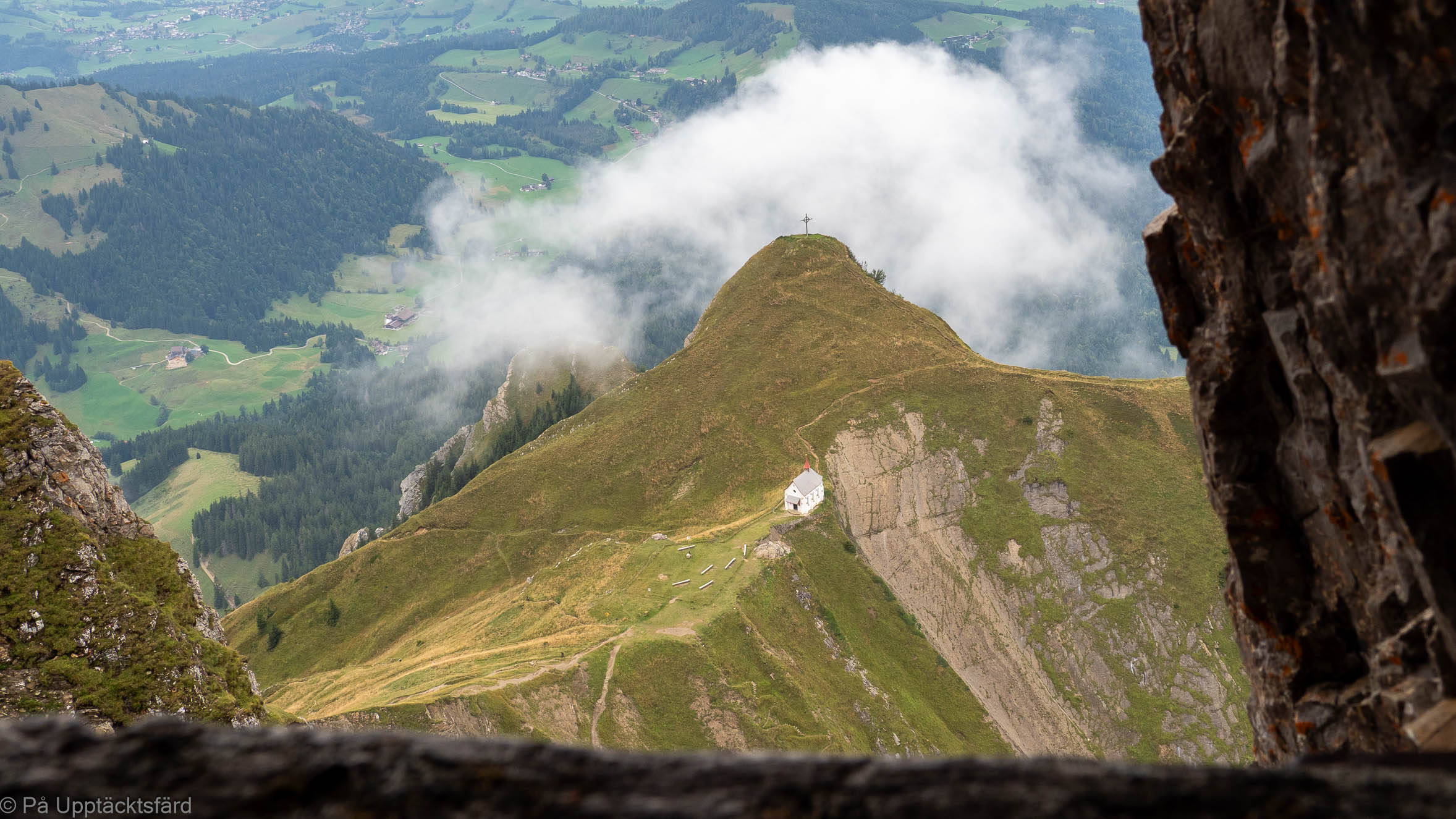 Under toppen syns på håll ett kapell, Klimsenkapelle som ligger på 1 864 meters höjd i Pilatusmassivet. Tänk vilken arbetsinsats det var att forsla byggmaterialet upp till dessa väglösa höjder!