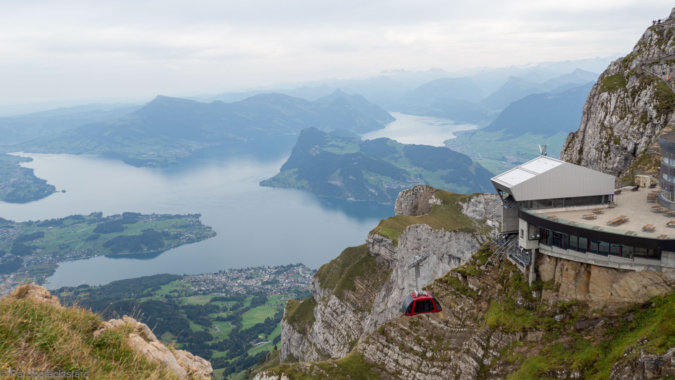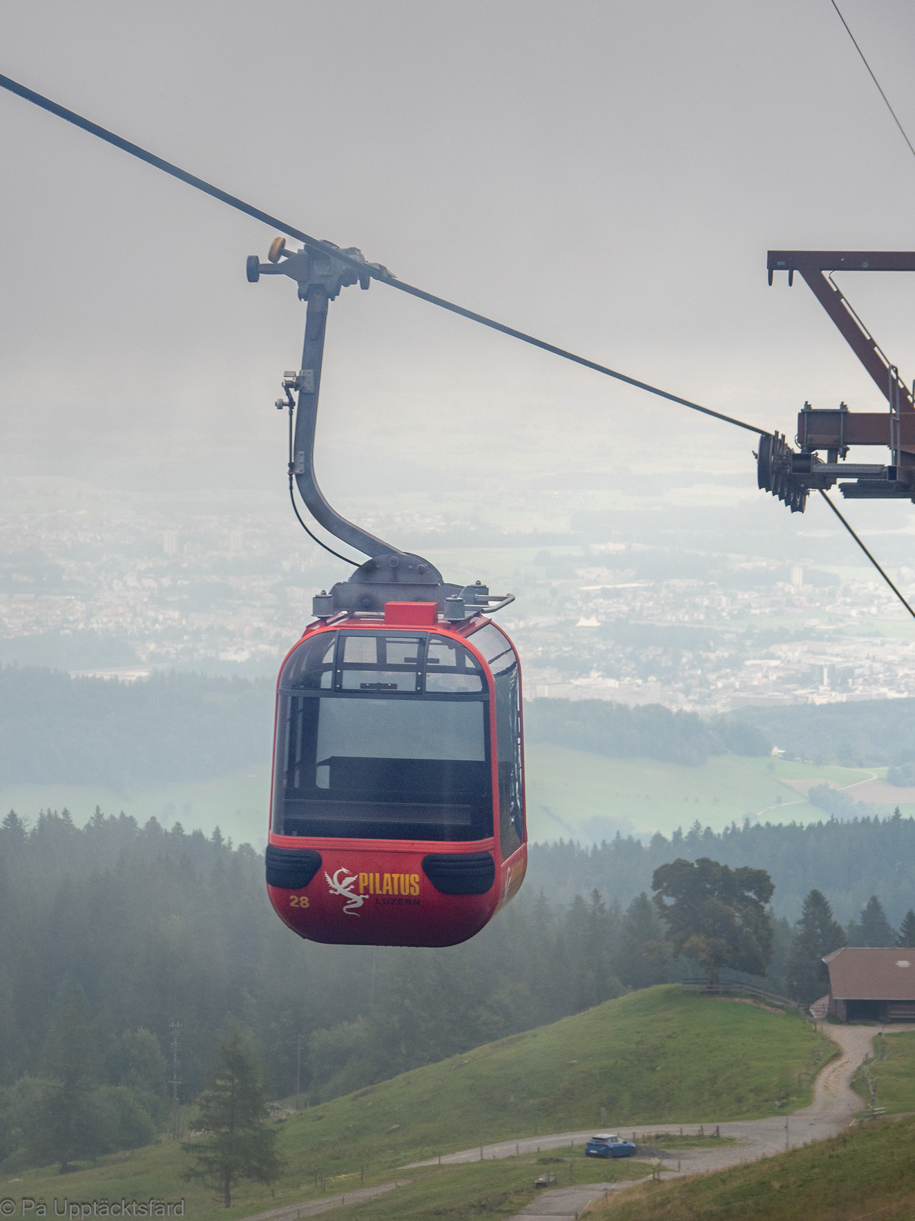 Tåget till Luzern far fram genom böljande kullar och gröna ängar. Under tågresan från Luzern till Alpnachstad skymtas både Vierwaldstättersjön och flera berg, däribland Pilatus i egen majestät, en grönklädd och stenig alptopp. Står i kön till bergbanan och diskuterar tiotusenkronorsfrågan vid panoramafärder: var ska vi sitta? Efter en del dividerande bestämmer vi oss för att sitta längst bak på högra sidan, för att få mycket sjöutsikt.