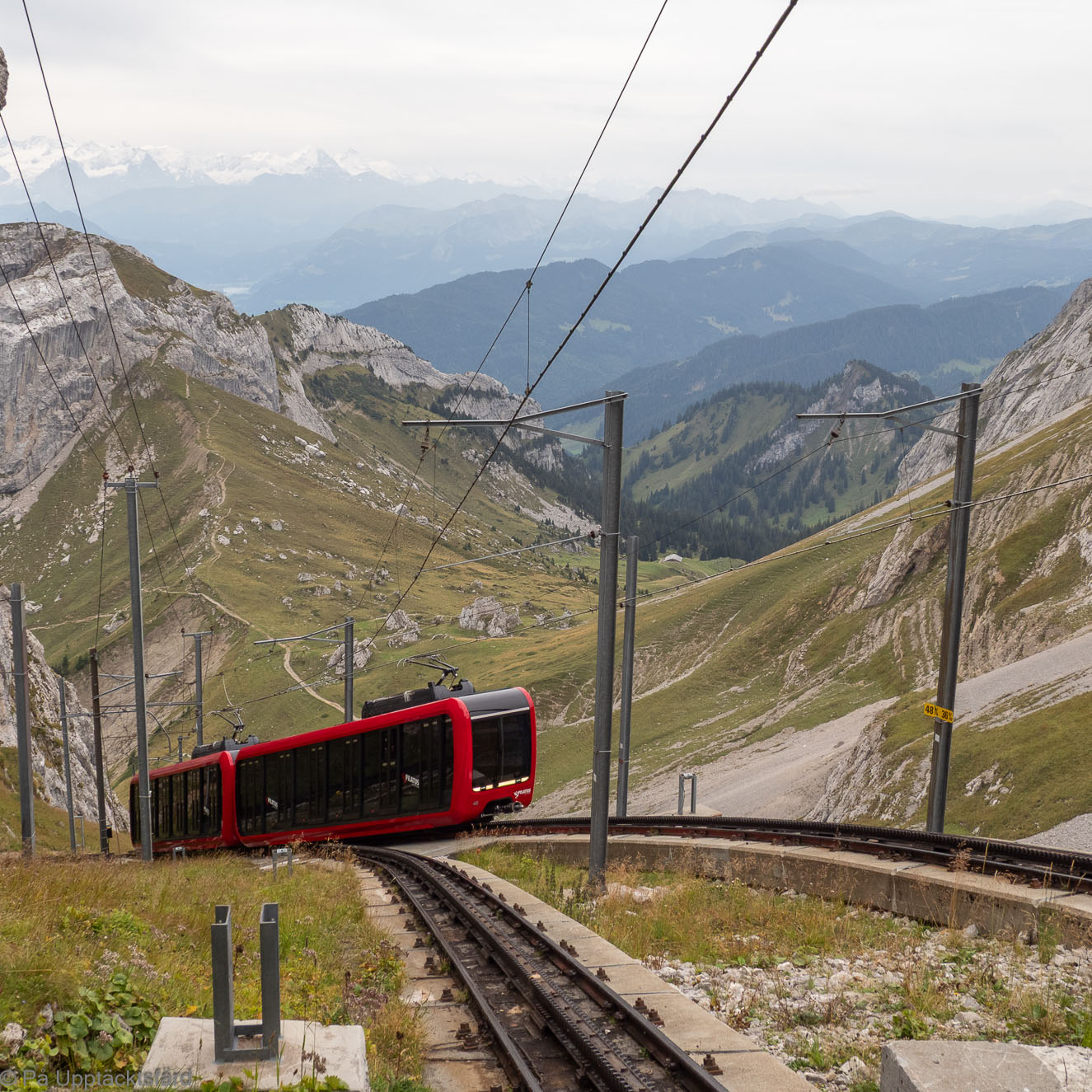 En tunnel och sedan, i höjd med mellanstationen Ämsigen börjar vyerna att öppnas. Bakom oss reser sig alptoppar, varav några är vita. Så visar sig den magnifika mörkgröna sjön Vierwaldstättersjön. Bjällerklang ekar från ängen bredvid medan vyerna blir alltmer storslagna. Framme vid Pilatus Kulm.
