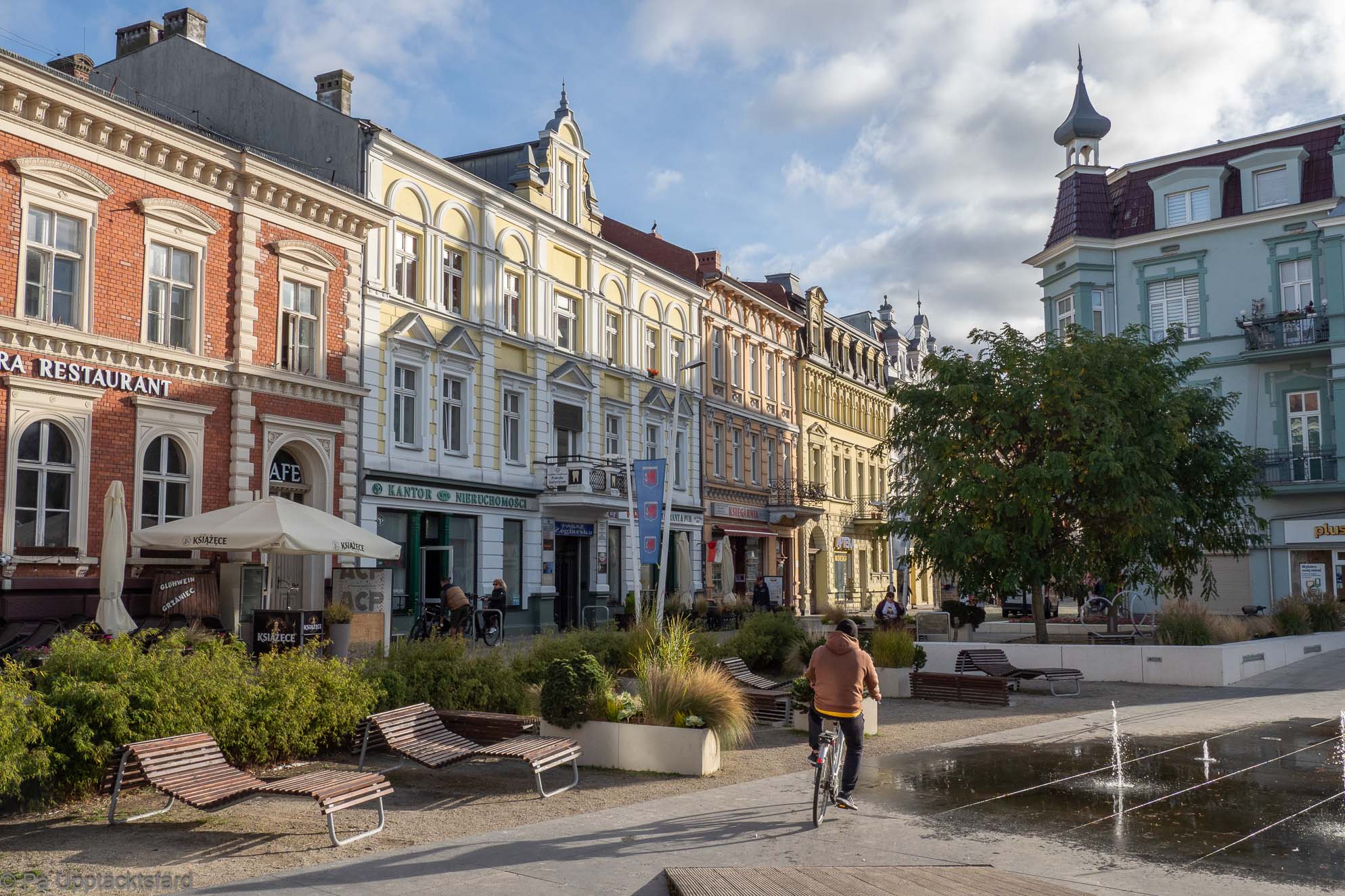Framme vid blomsmyckade torget Plac Wolnosci står vi inför en brokig blandning av nya och varsamt renoverade gamla hus. Folk solar sig vid fontänen vid ljugarbänkarna eller vid uteserveringarna.