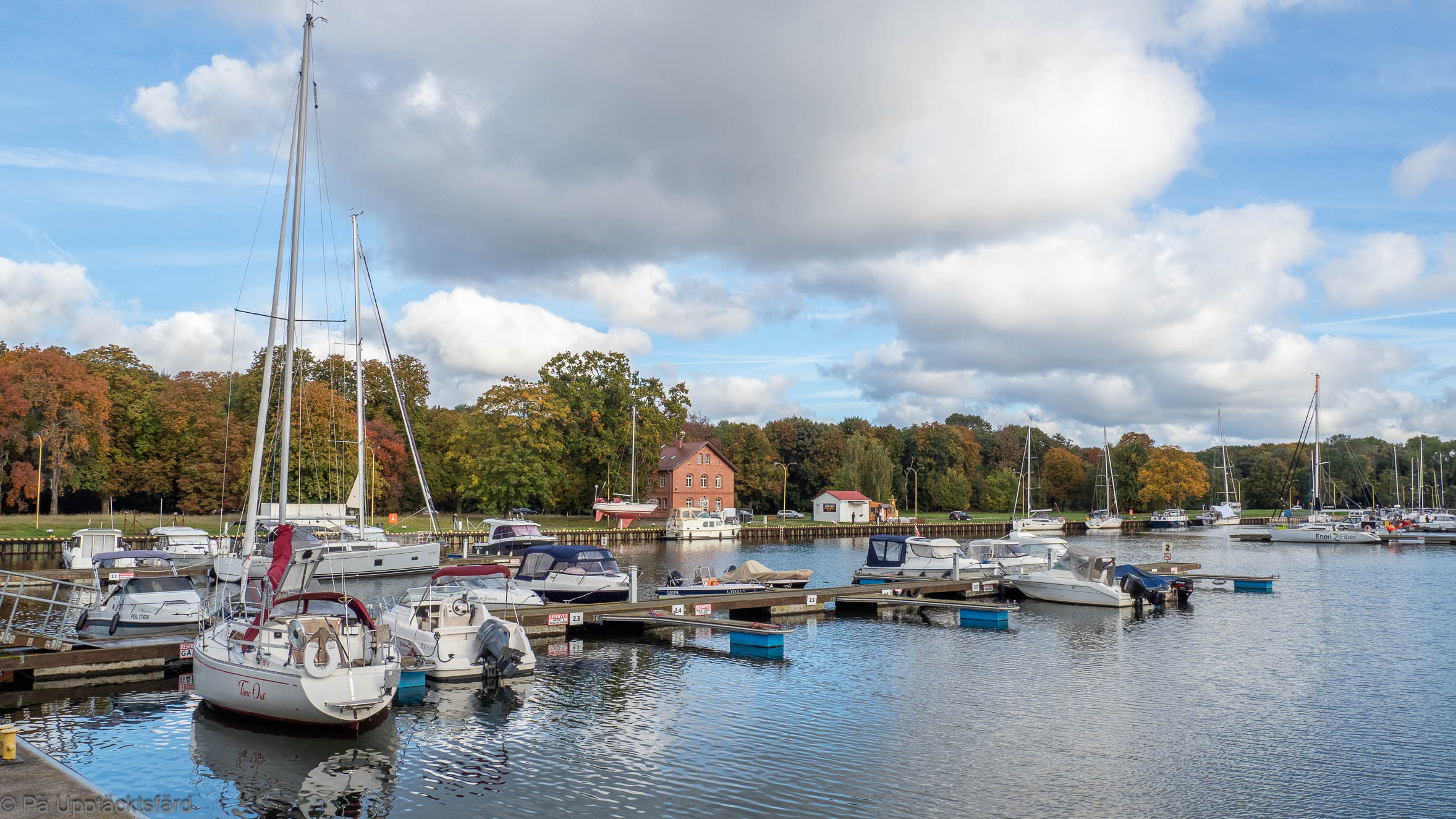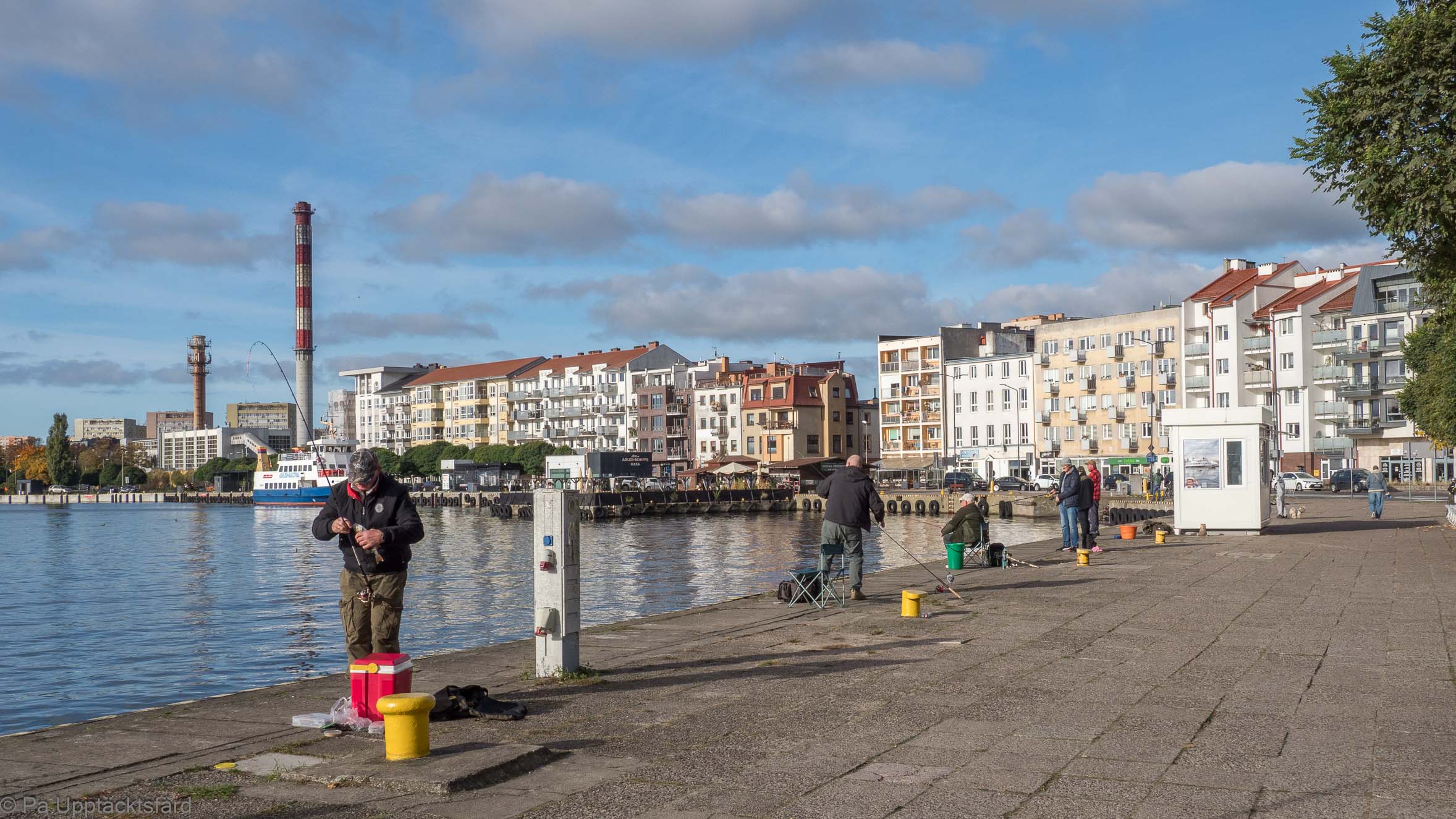 De verkar ha fiskelycka. Vid floden Swine står en lång rad av hobbyfiskare och drar framför våra ögon upp den ena abborren efter den andra. Intill hamnkontorets ståtliga byggnad är det knappt någon biltrafik. De höstfärgade löven på träd och framförallt på marken doftar angenämt av förmultnade löv.