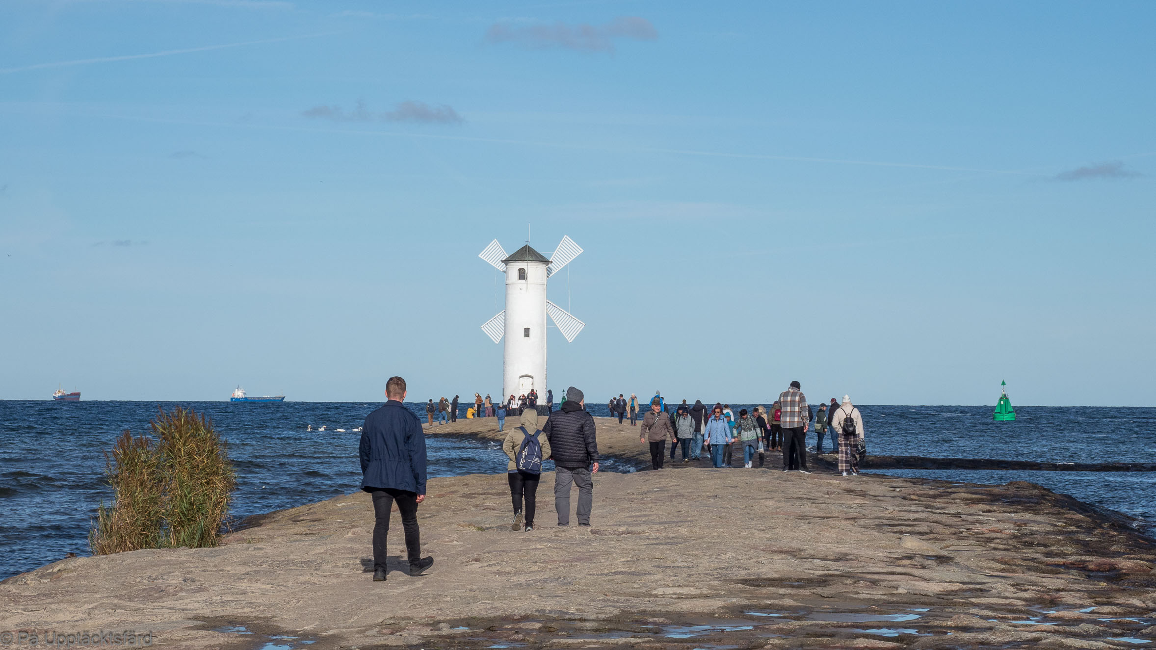 Snålblåsten vid det öppna havet tycks inte hindra någon från att utforska omgivningen runt och ta selfies vid Stawa Mlyny. Vi är lika goda kålsupare som alla andra. Tack vare stillsamma vågor vågar vi gå ända ut på piren, annars hade det inte gått. Här är vi inte ensamma, en svanfamilj guppar intill.