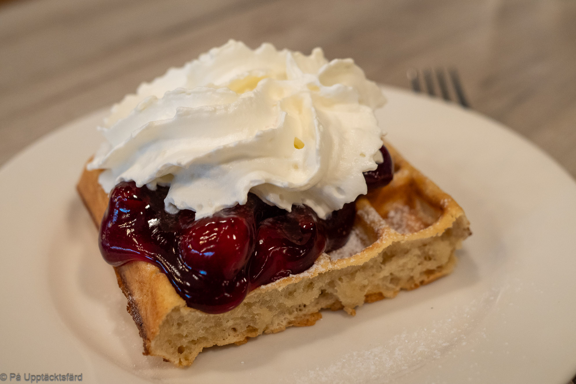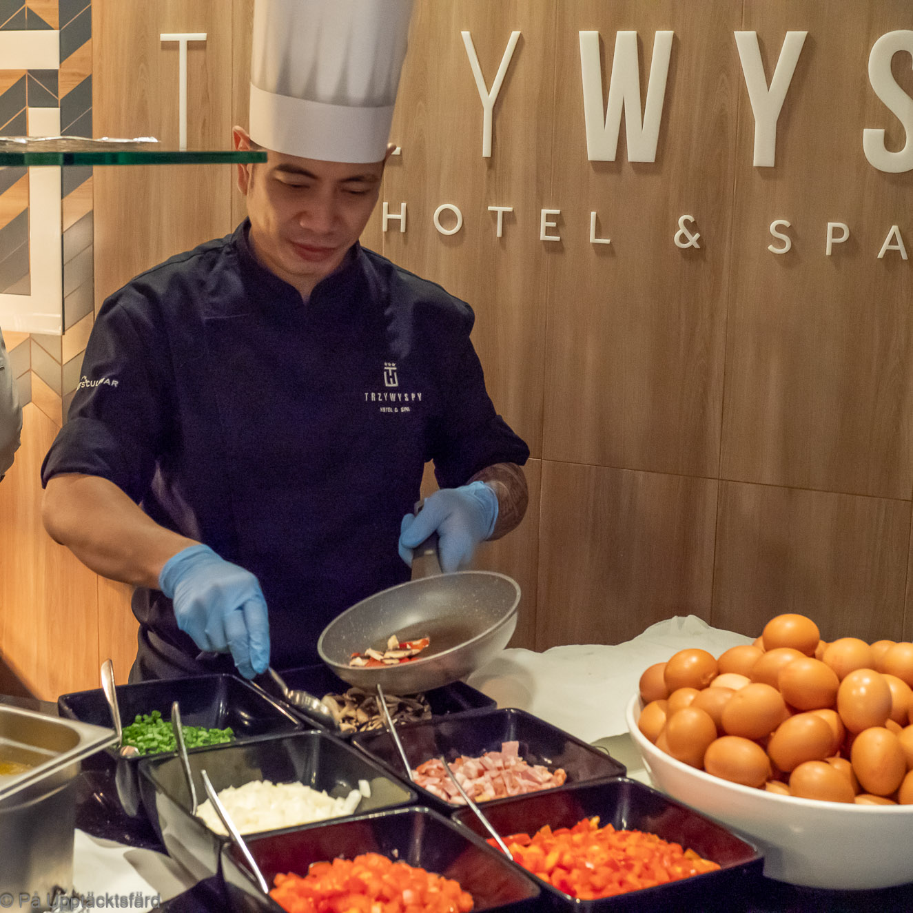 Så även receptionisterna på Hotel & SPA Trzy Wyspy, där vi laddar upp med en rejäl frukost. Här vankas såväl internationella som polska specialiteter: saltgurka, rökt fisk, äggsallad, gröt och mycket mer. Vi provar även en våffla med körsbärssylt och grädde och beställer en omelett hos äggkocken. Nu har vi gott om energi!